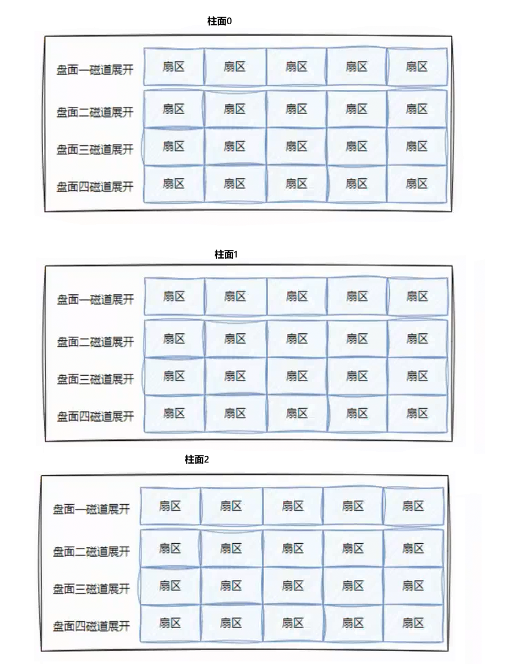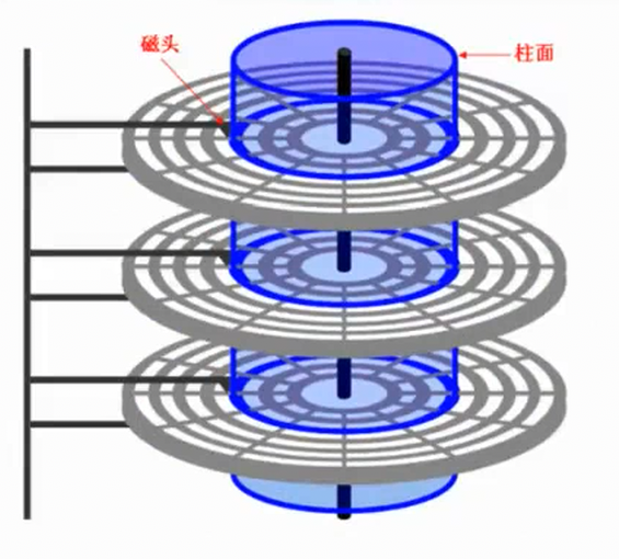 磁盘在物理上分成了很多柱面,我们要把磁盘理解为由柱面卷成的柱形。