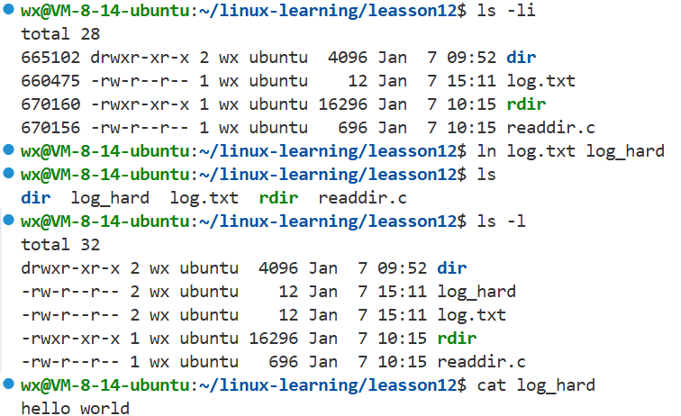 - 硬链接本质就是在当前目录下(在目录文件内容中)添加"一个字符串(文件名)与目标文件inode(这个数字)的映射关系"