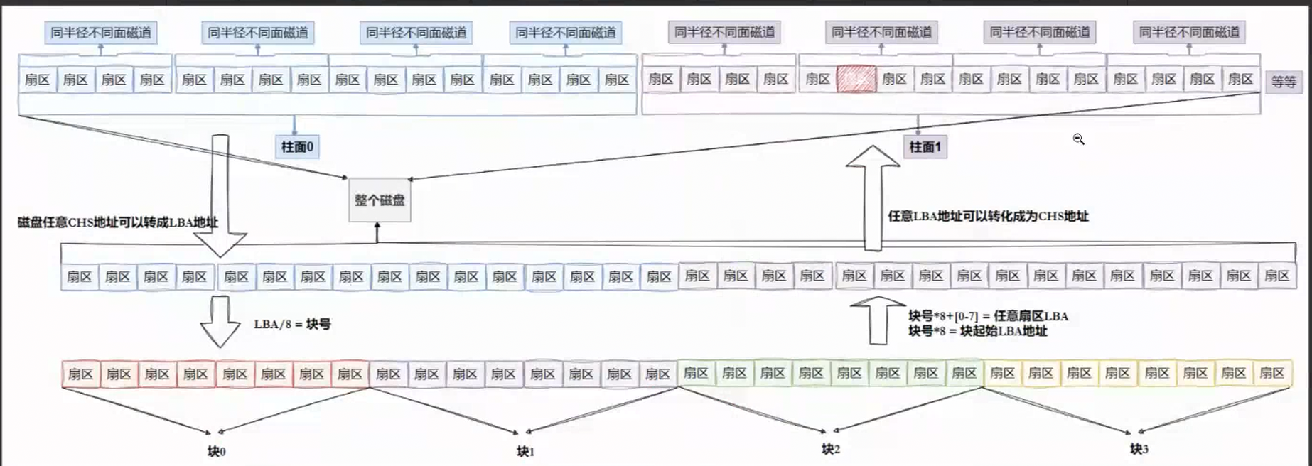 即:LBA=柱面号C*(磁头数*每磁道扇区数)+磁头号H*每磁道扇区数+扇区号S-1