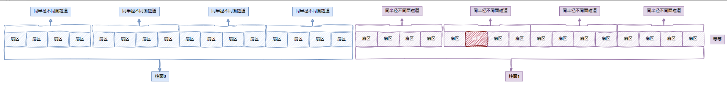在读写数据时,是磁头在工作,其中一个磁头移动,其他磁头都会一起跟着移动,所以在确定扇区读写数据时,其实先定位的是在哪一个柱面上(不同盘面中相同半径的所有磁道)