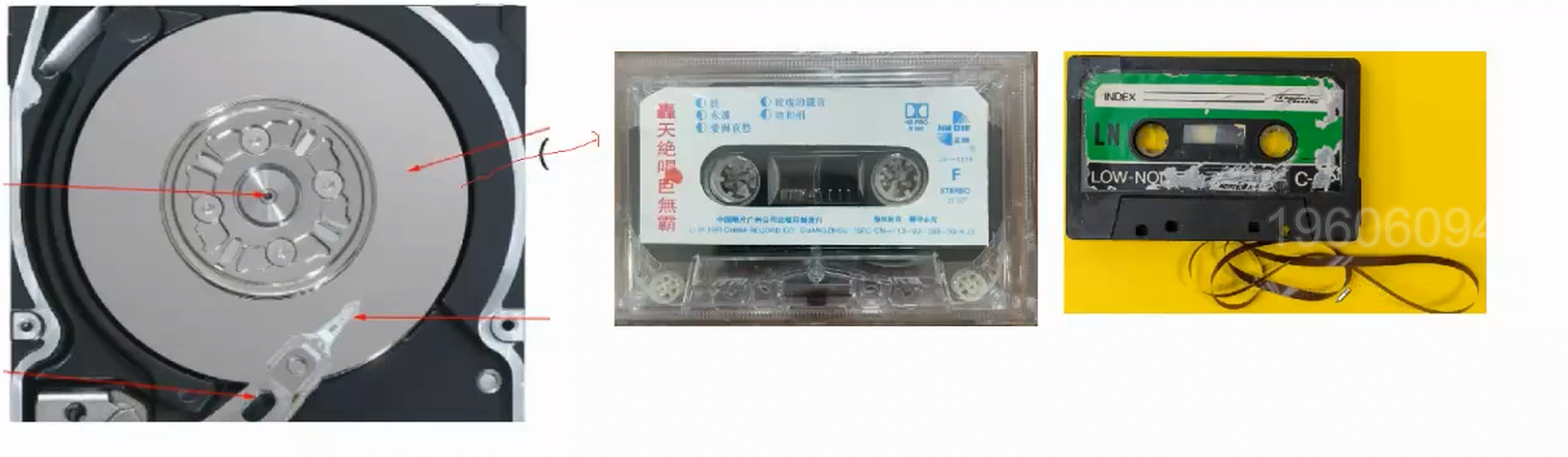- 细节:传动臂上的磁头是共进退的(这点比较重要,后面会说明)