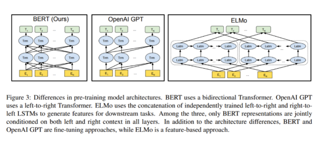 BERT使用双向Transformer,OpenAI GPT使用从左到右的Transformer,而ELMo则使用独立训练的从左到右和从右到左的LSTM的拼接来为下游任务生成特征。在这三种模型中,只有BERT的表示在所有层中都同时依赖于左右上下文。