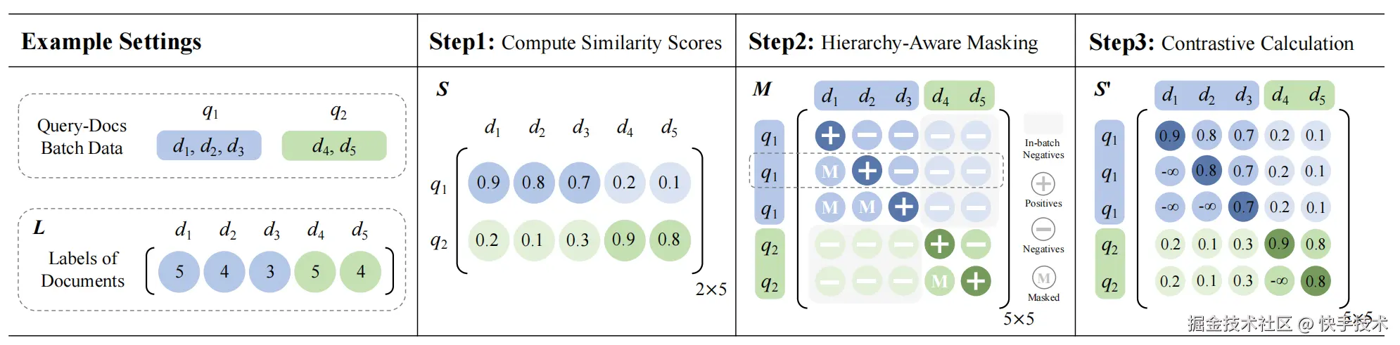 H-InfoNCE 在这里通过样例标签矩阵、样本 mask 矩阵等得到了高效实现。