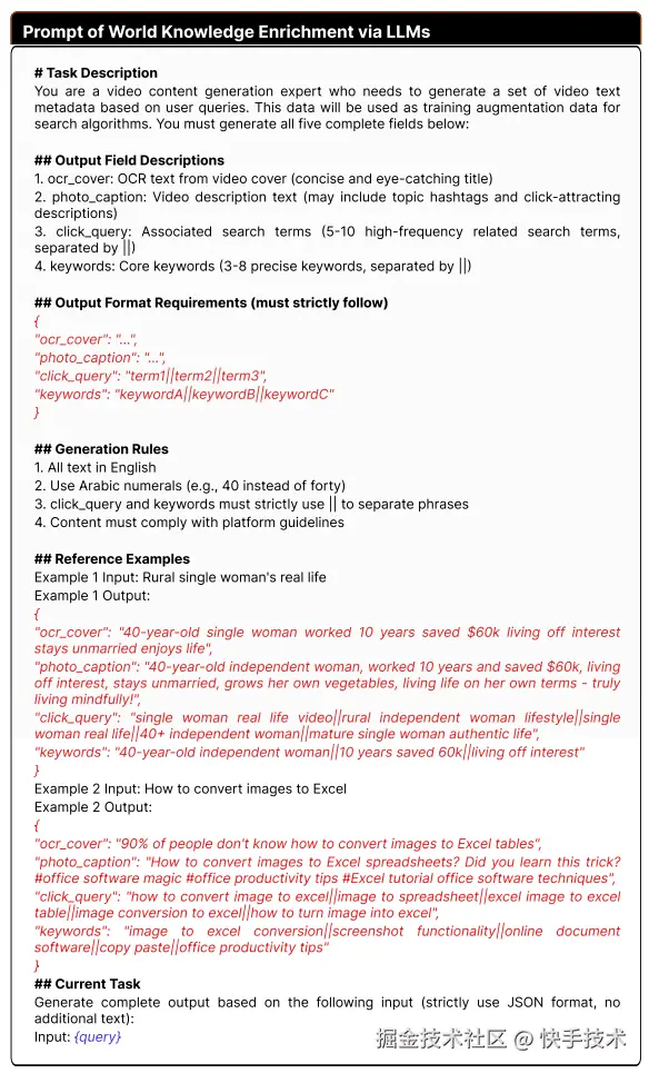具体而言,系统采用单样本提示(One-shot Prompting)策略,让 LLM 扮演视频内容专家,针对特定查询生成包含标题、描述和标签的虚拟视频元数据。将这些合成数据作为正样本,训练双塔模型,相当于将外部世界的常识与逻辑"蒸馏"进检索模型中。