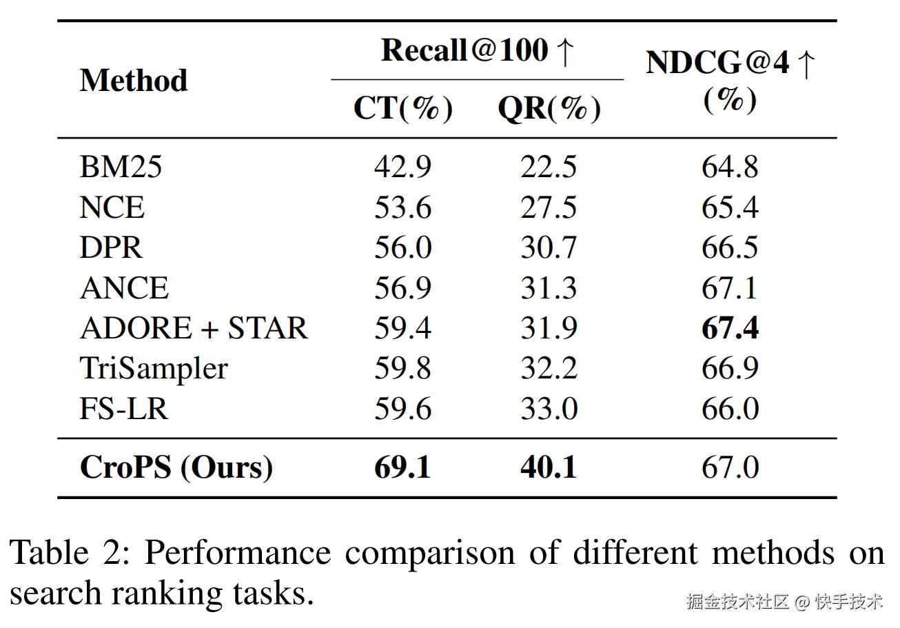 在离线实验测试中,CroPS 相较于最强基线 FS-LR 在 CT 数据集上提升 9.5%,在换 Query 测试集 QR 上提升 7.1%。同时 NDCG@4 和 最强基线相当(67.4%->67.0%)