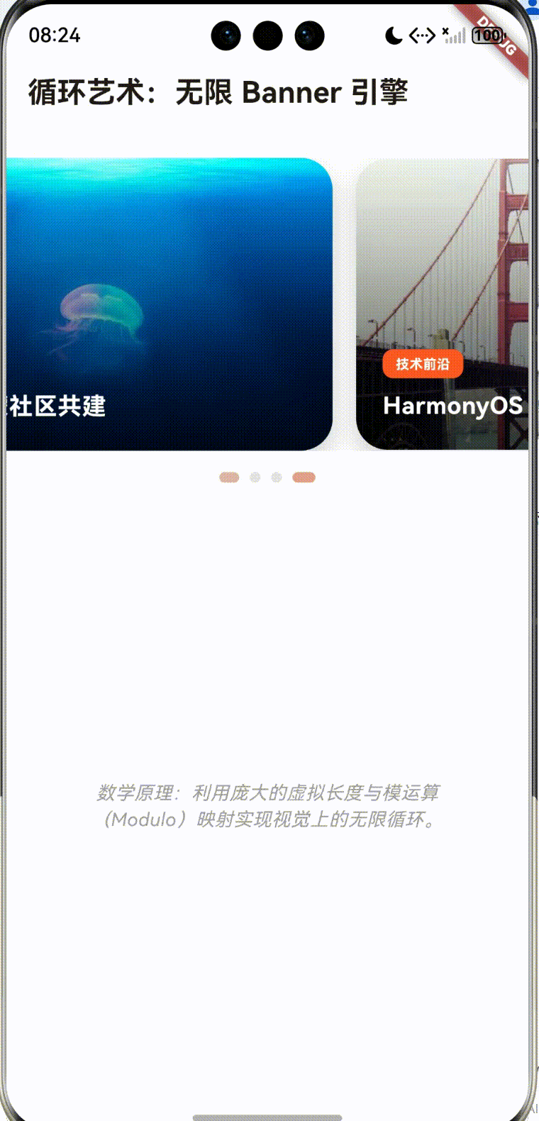 在 lib/main.dart 中,我们实现了一个支持自动轮播、无限滚动的 "Harmony Carousel"。