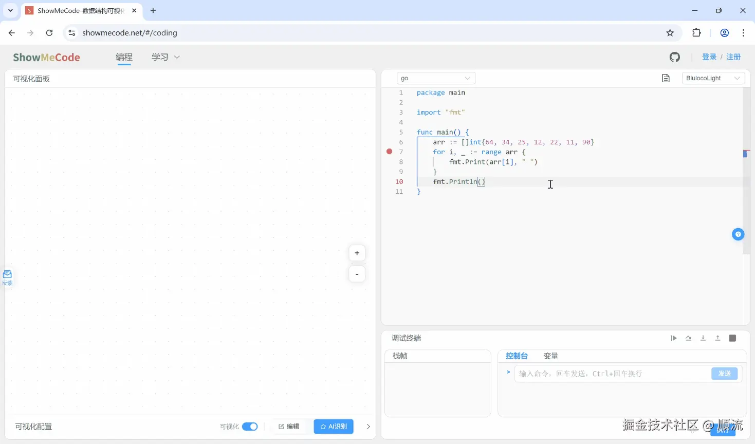 简单来说,就是你可以在网页上写代码、设断点、单步调试,同时看到链表、二叉树这些数据结构的动态变化。效果大概是这样: