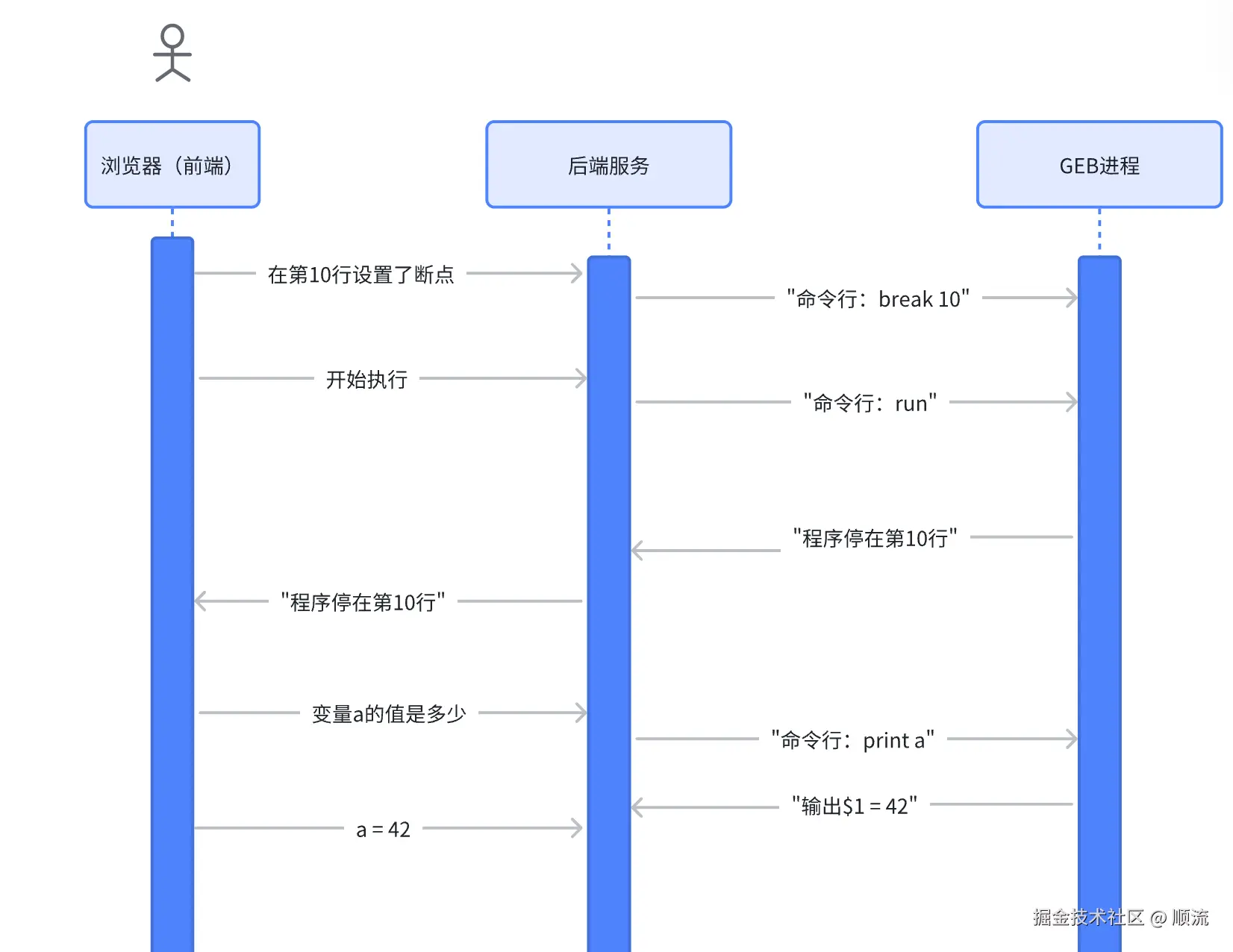 既然 GDB 已经能调试程序了,最简单的做法就是:让后端启动 GDB,把用户的操作翻译成 GDB 命令。