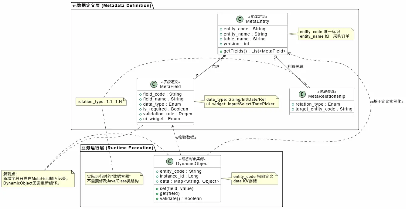 通过引入元数据引擎(Metadata Engine),我们将业务对象的定义(字段、类型、校验规则、界面布局)抽离出来,存放在数据库中,而不是代码里。