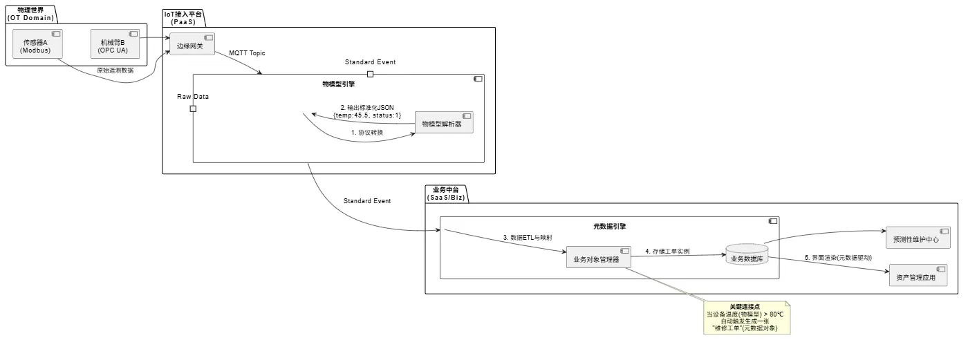 在企业级应用(尤其是SaaS、PaaS、工业互联网或复杂的业务中台)中,"元数据"和"物模型"确实是实现架构高内聚、低耦合的两大核心利器。