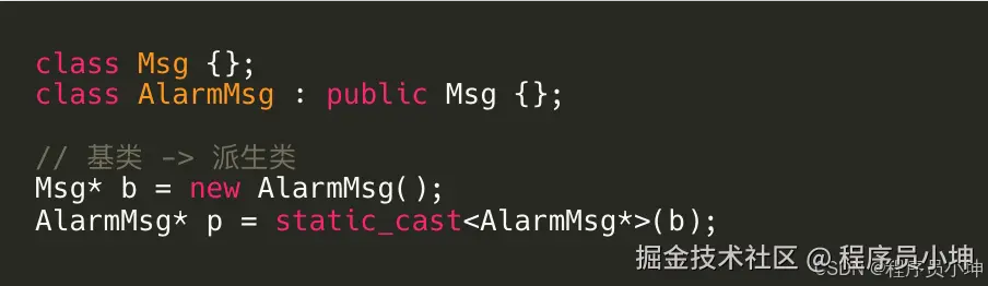 dynamic_cast 运行期检查,要查 RTTI,适合你不确定的向下转型(从Msg* 转 AlarmMsg*),失败了返回 nullptr 或抛异常。
