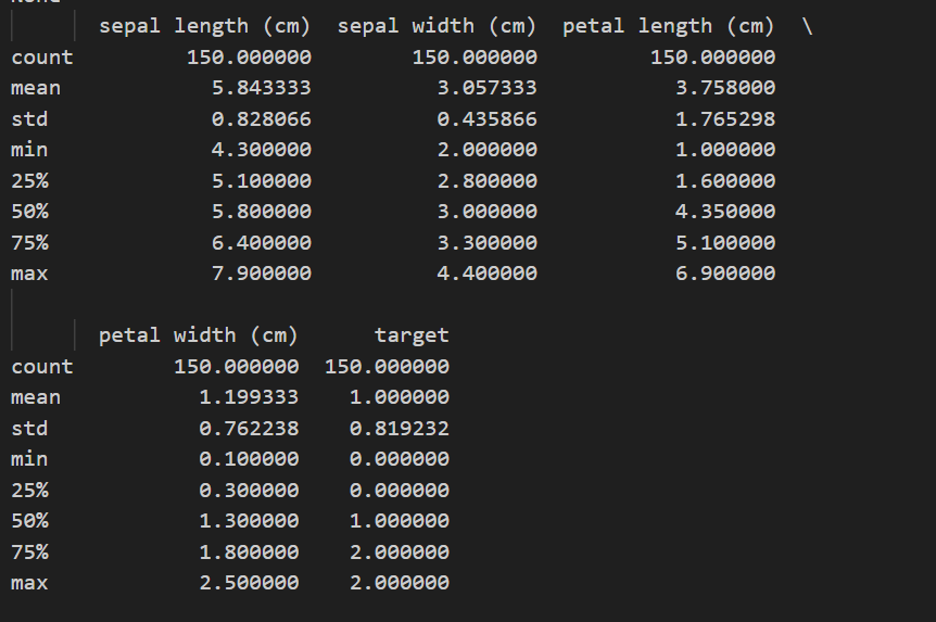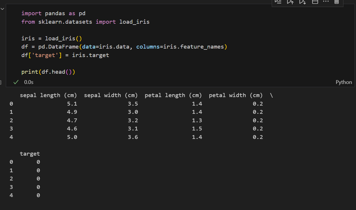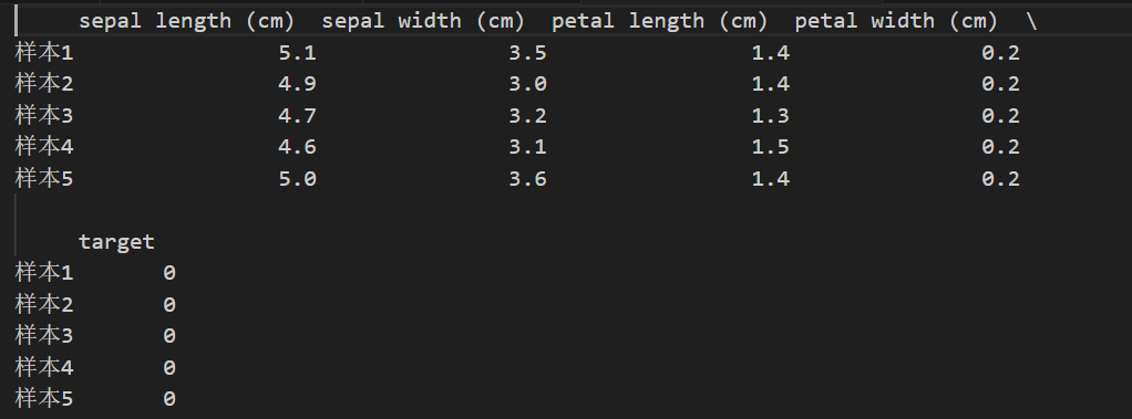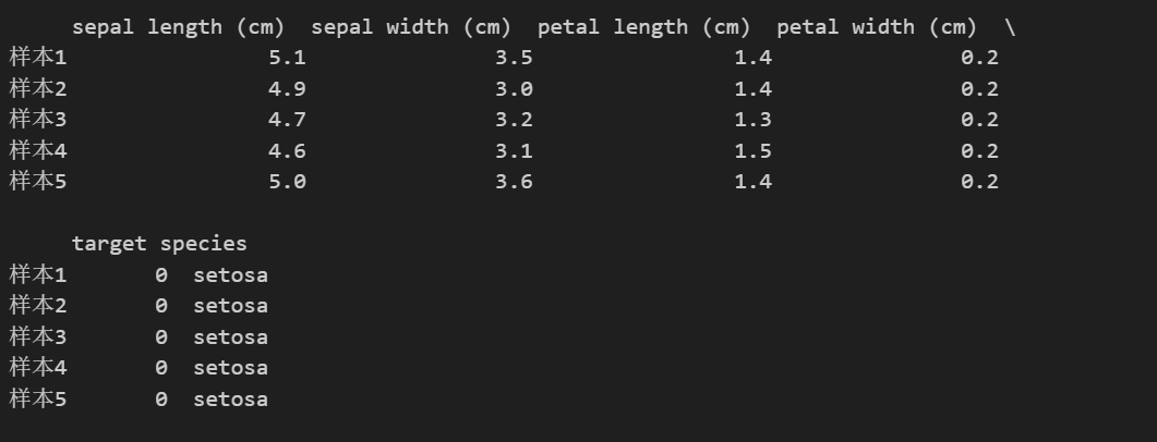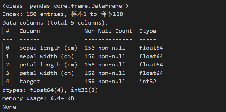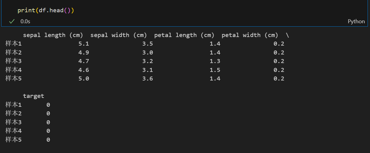 上面代码加载了鸢尾花数据集为DataFrame,并展示了其结构(注意为了展示,df['target'] = iris.target是必须的,DataFrame默认不会加载target标签)