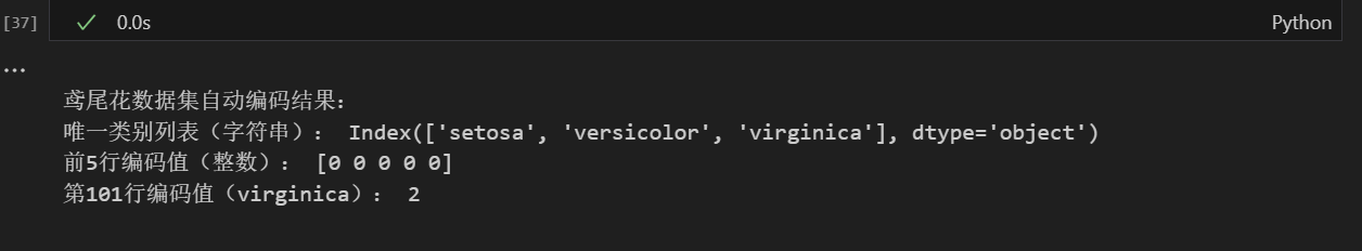 print("第101行编码值(virginica):", target_encoded[100]) # 改为打印编码值