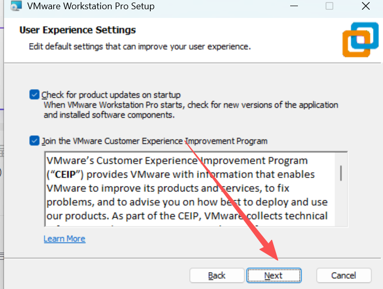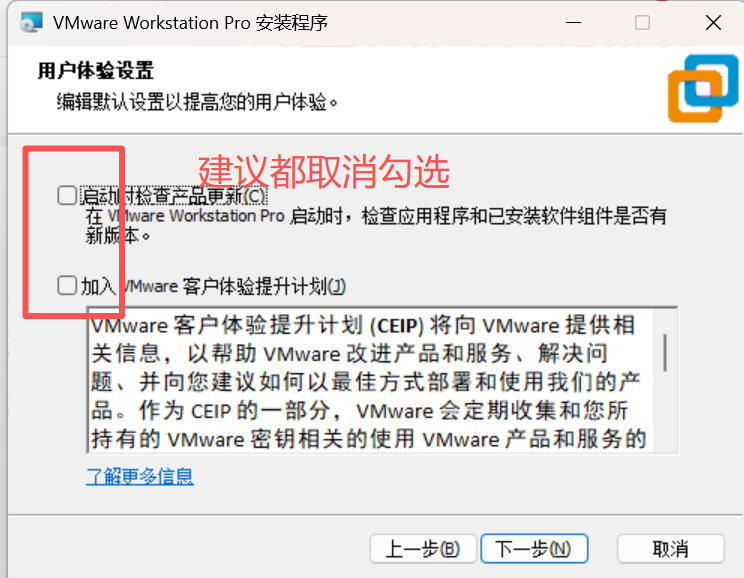 "加入客户体验提升计划":取消后不会向 VMware 发送使用数据,更保护隐私。
