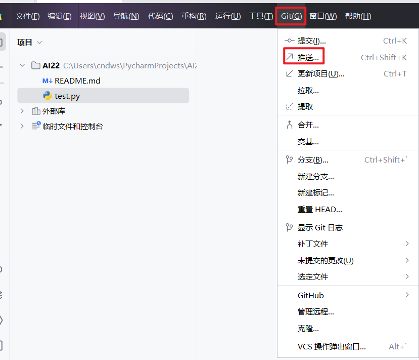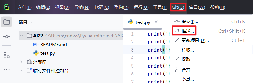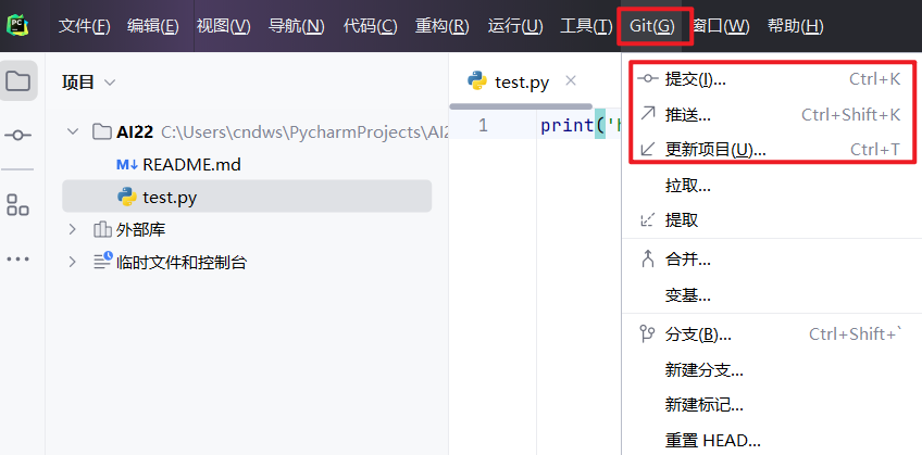 后续就可以在pycharm中开发, 在自己的分支中开发, 开发后把相关的内容提交到仓库中即可, 并且可以每日推送到远端仓库