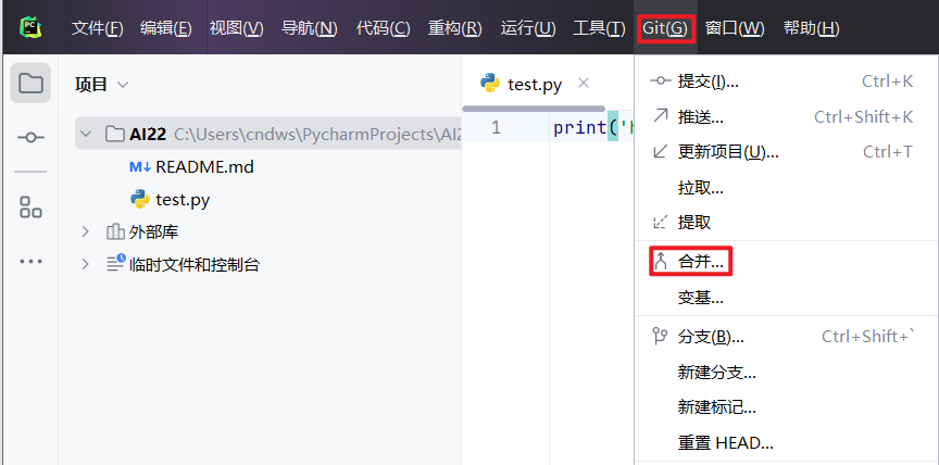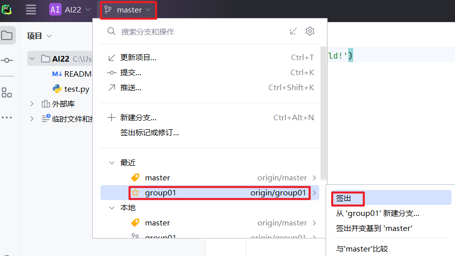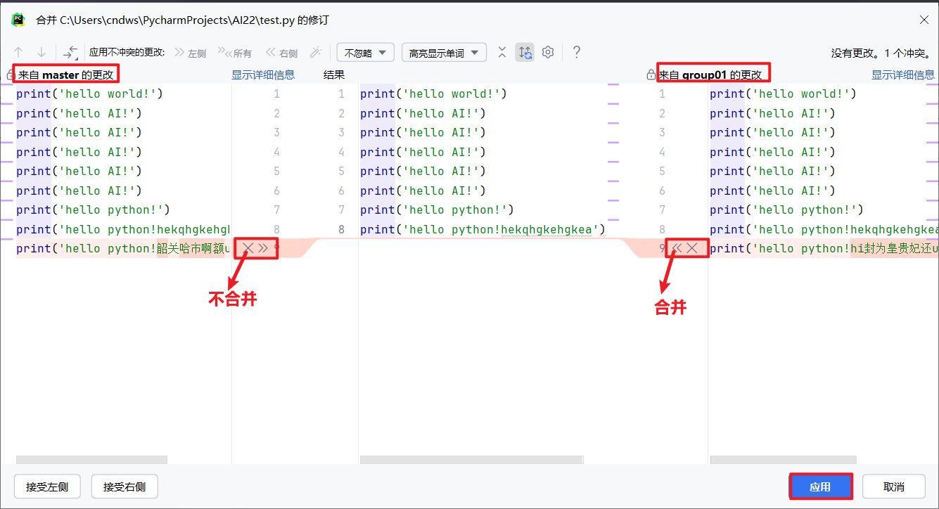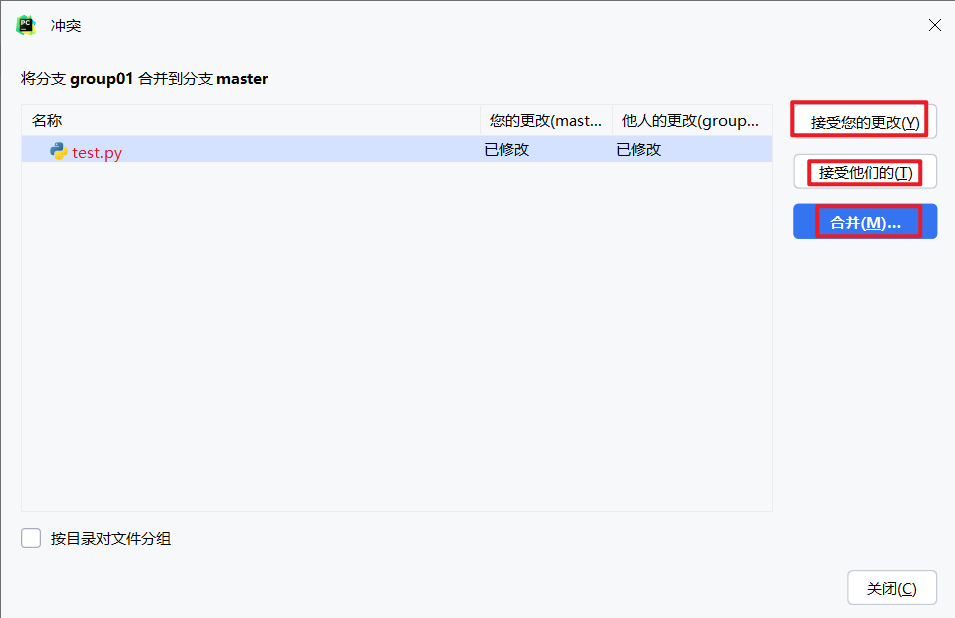 master和group01分支分别修改test.py commit push后,master合并group01时会发生冲突