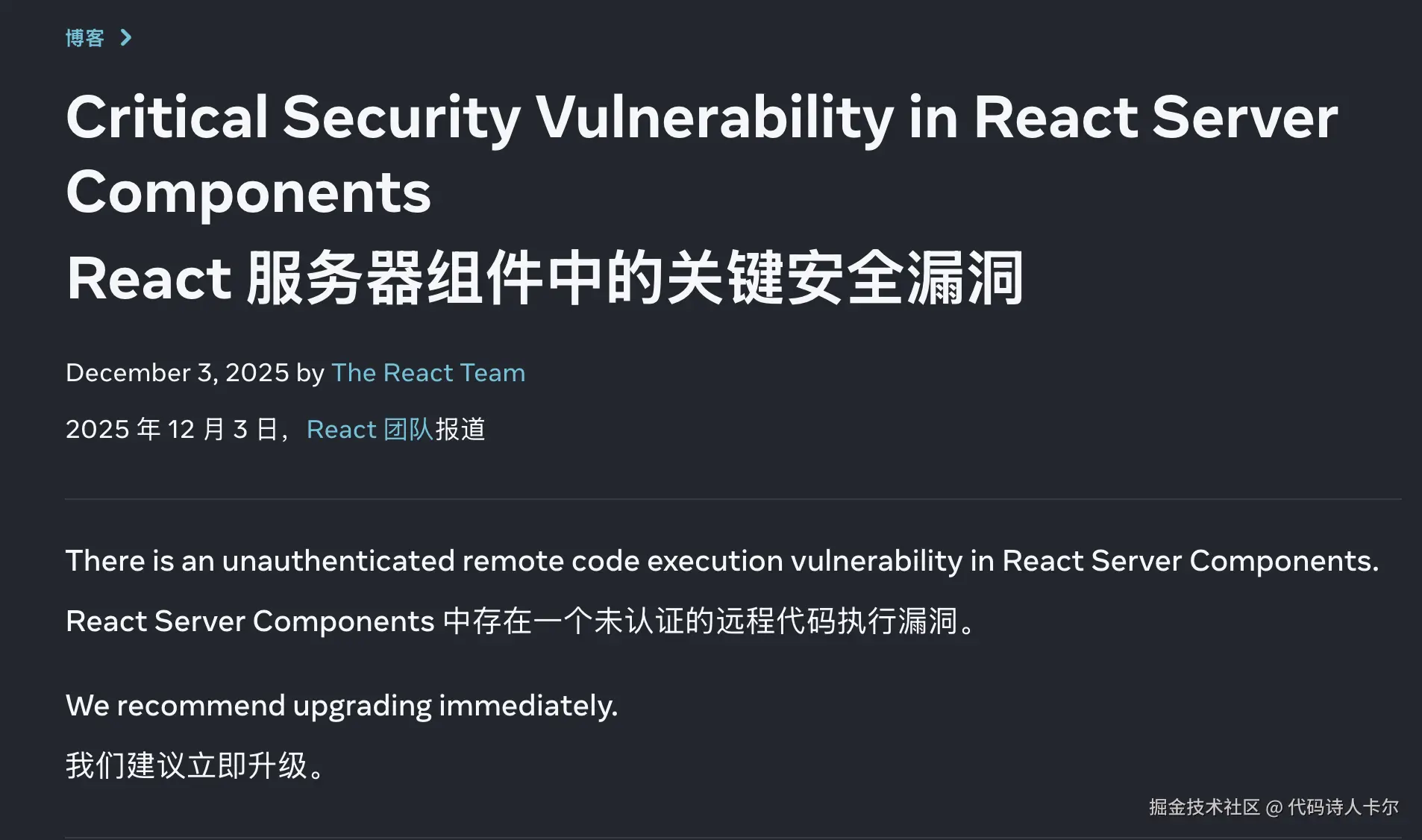 React2Shell 漏洞是 React 服务器组件中一个非常严重的漏洞。漏洞评分为10分,简单来说,这个漏洞可以让攻击者随便控制你的服务器。所以严重程度不用多说了。