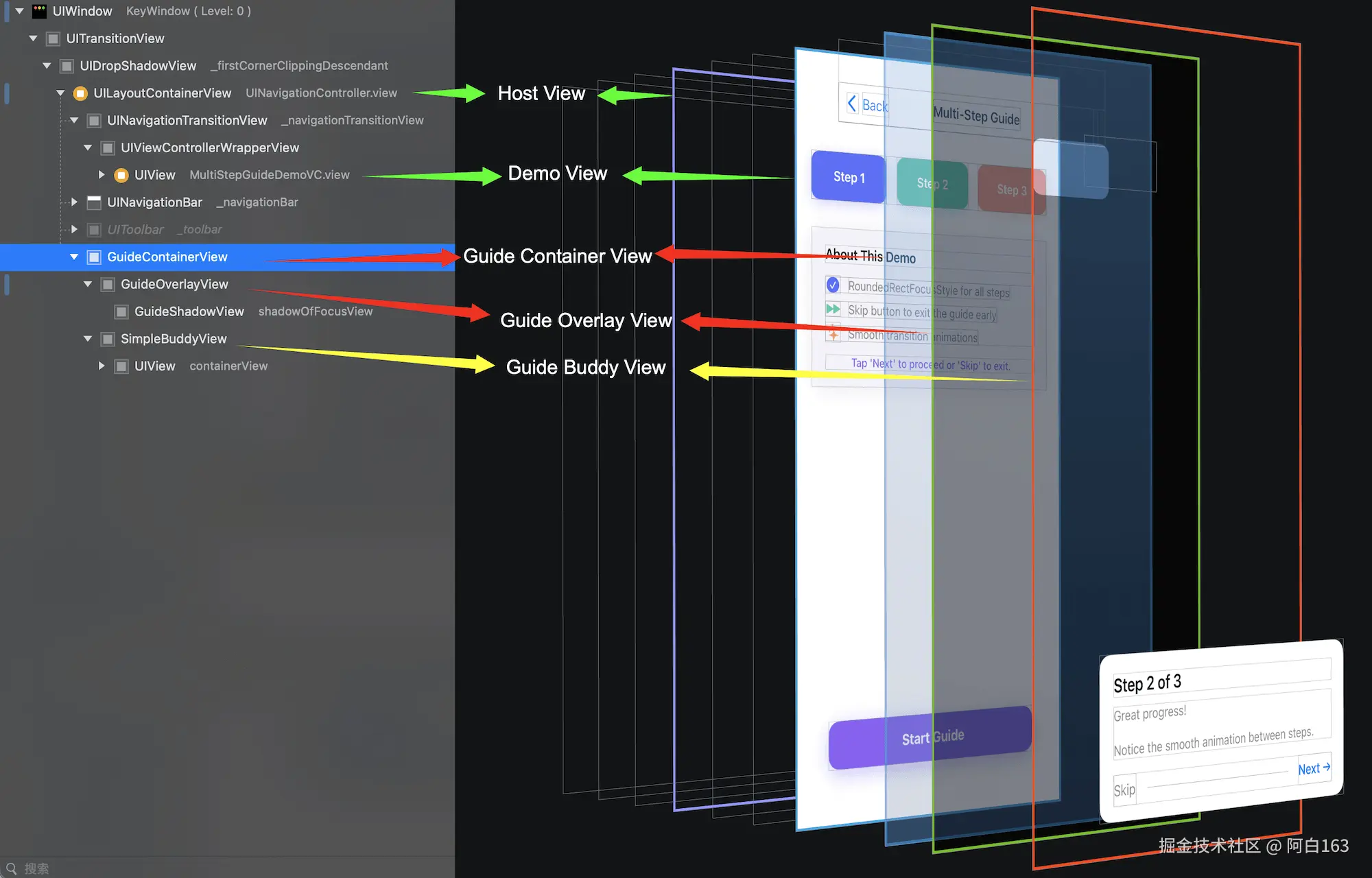 (步骤配置)"] end subgraph ViewHierarchy["视图层级"] GuideContainerView["GuideContainerView