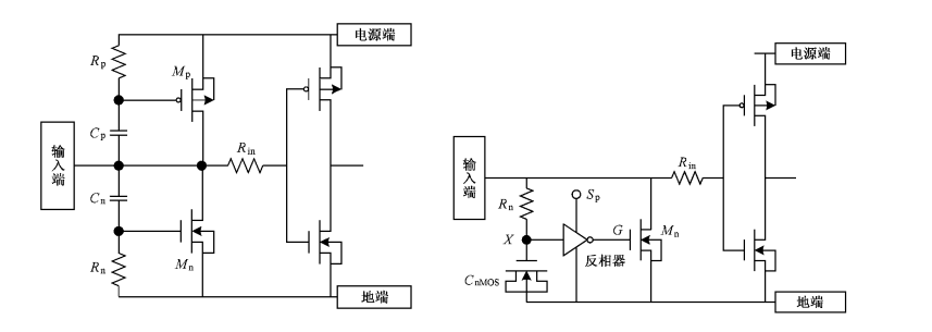 图1 栅耦合型MOS管ESD保护结构 (左)gcMOS,(右)MC-gcMOS