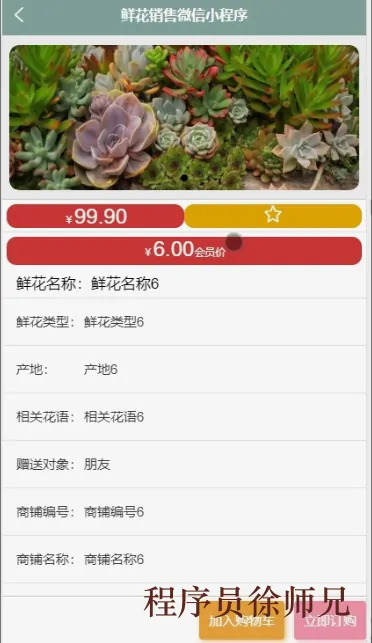 鲜花信息,在鲜花信息页面可以查看鲜花名称、鲜花类型、图片、价格、鲜花类型、产地、相关花语、赠送对象、商铺编号、商铺名称等信息,并进行加入购物车,立即订购,评论和收藏操作;如图4-2所示。