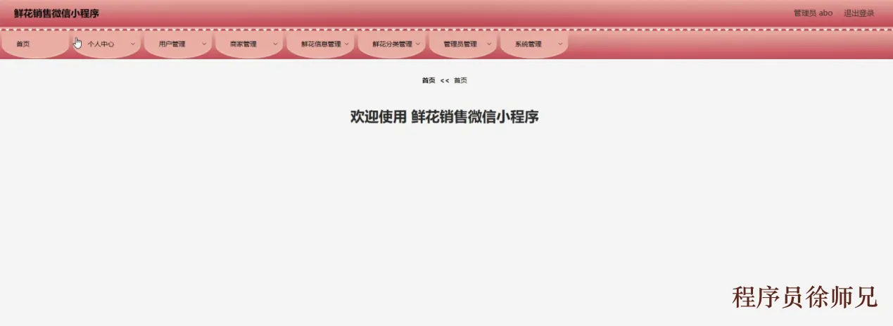 管理员登陆系统后,可以对首页、个人中心、用户管理、商家管理、鲜花信息管理、鲜花分类管理、管理员管理、系统管理等功能进行相应操作,如图4-4所示。