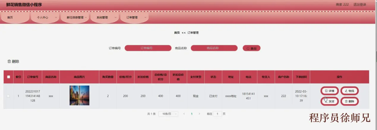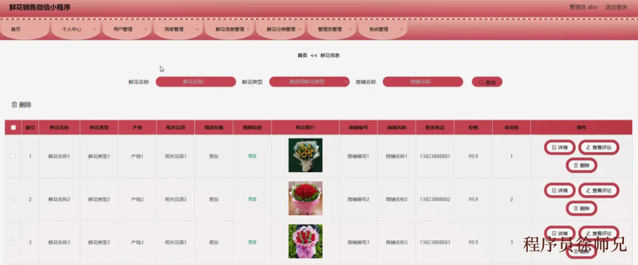 鲜花信息管理,在鲜花信息管理页面可以对索引、鲜花名称、鲜花类型、产地、相关花语、赠送对象、视频信息、鲜花图片、商铺编号、商铺名称、联系电话、价格、会员价等内容进行详情,修改,查看评论和删除等操作。