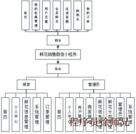 系统功能结构图是系统设计阶段,系统功能结构图只是这个阶段一个基础,整个系统的架构决定了系统的整体模式,是系统的根据。鲜花销售微信小程序的整个设计结构如图3-1所示。