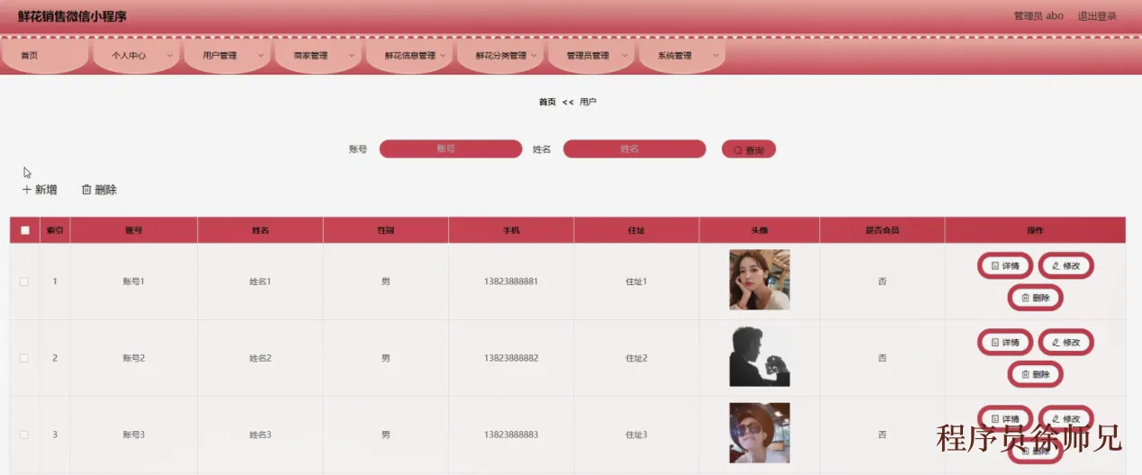 用户管理,在用户管理页面可以对索引、账号、姓名、性别、手机、住址、头像、是否会员等内容进行详情、修改或删除等操作,如图4-5所示。