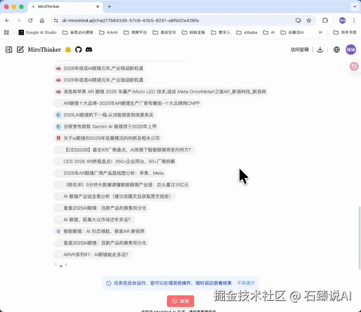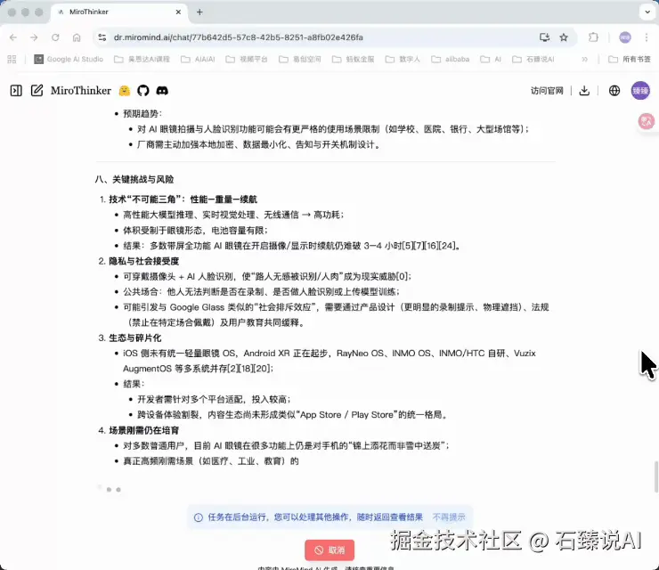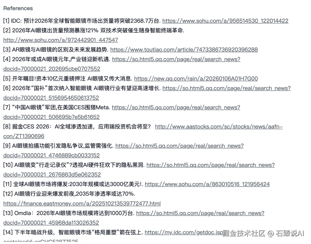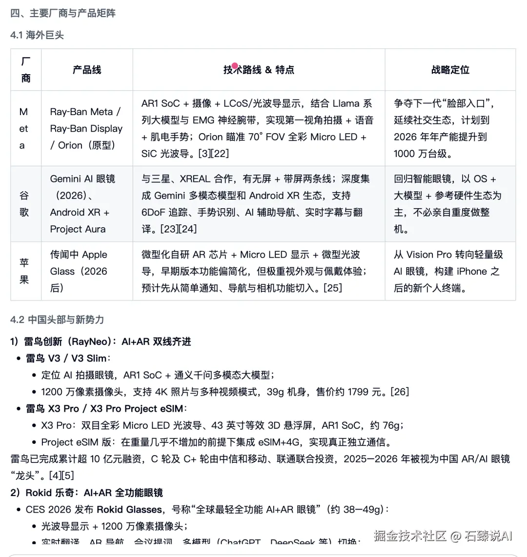 - 拆解与规划它没有立即生成文本,而是先展示了它的思考路径(Thinking Process)。它将任务拆解为"市场规模"、"核心玩家(Meta/Ray-Ban, Apple, 国内厂商)"、"技术瓶颈"、"未来趋势"等子任务 。