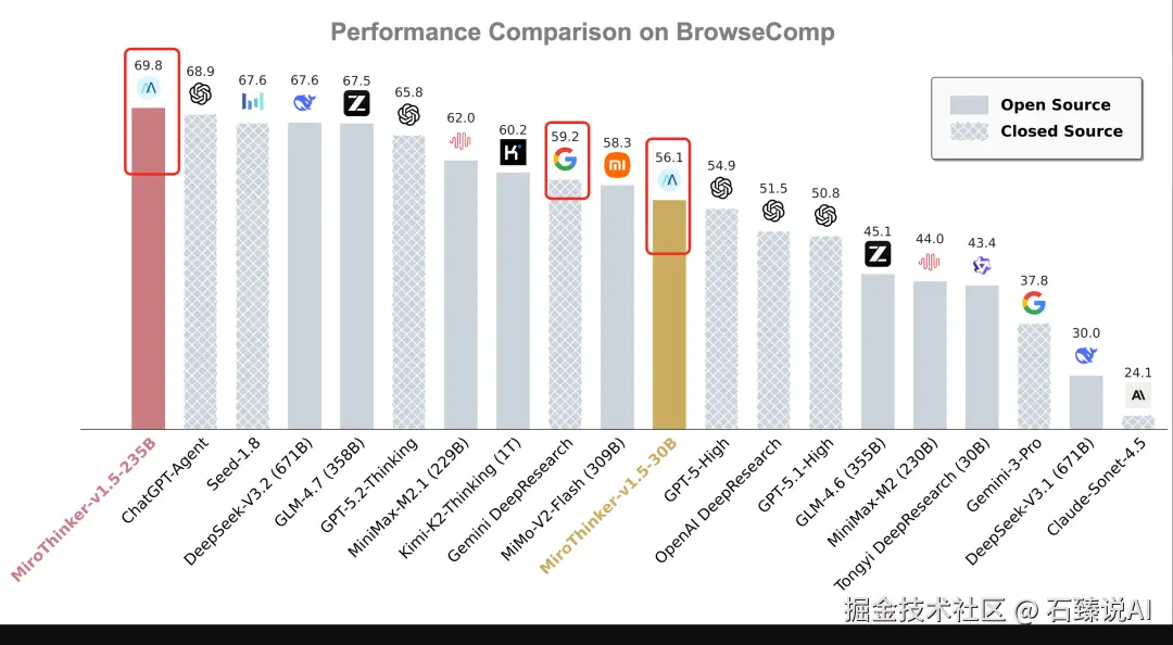 这意味着什么? 一个仅有 30B 参数的开源权重模型,在搜索与推理的综合能力上,几乎快要追平了 Google 顶级的闭源搜索模型 Gemini DeepSearch。