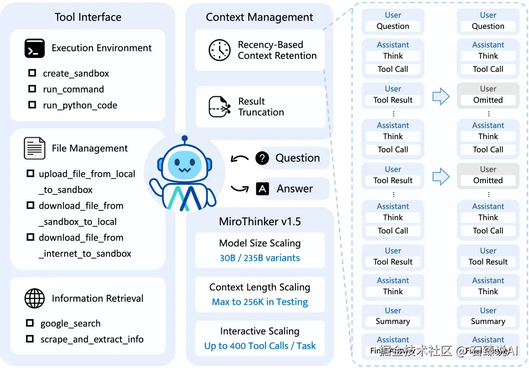 - 时序敏感训练沙盒:这是很多模型忽略的点。MiroThinker 在训练时强行约束模型"只能看过去,不能看未来",彻底杜绝了数据泄露(Future Leakage),确保了预测的真实性 。
