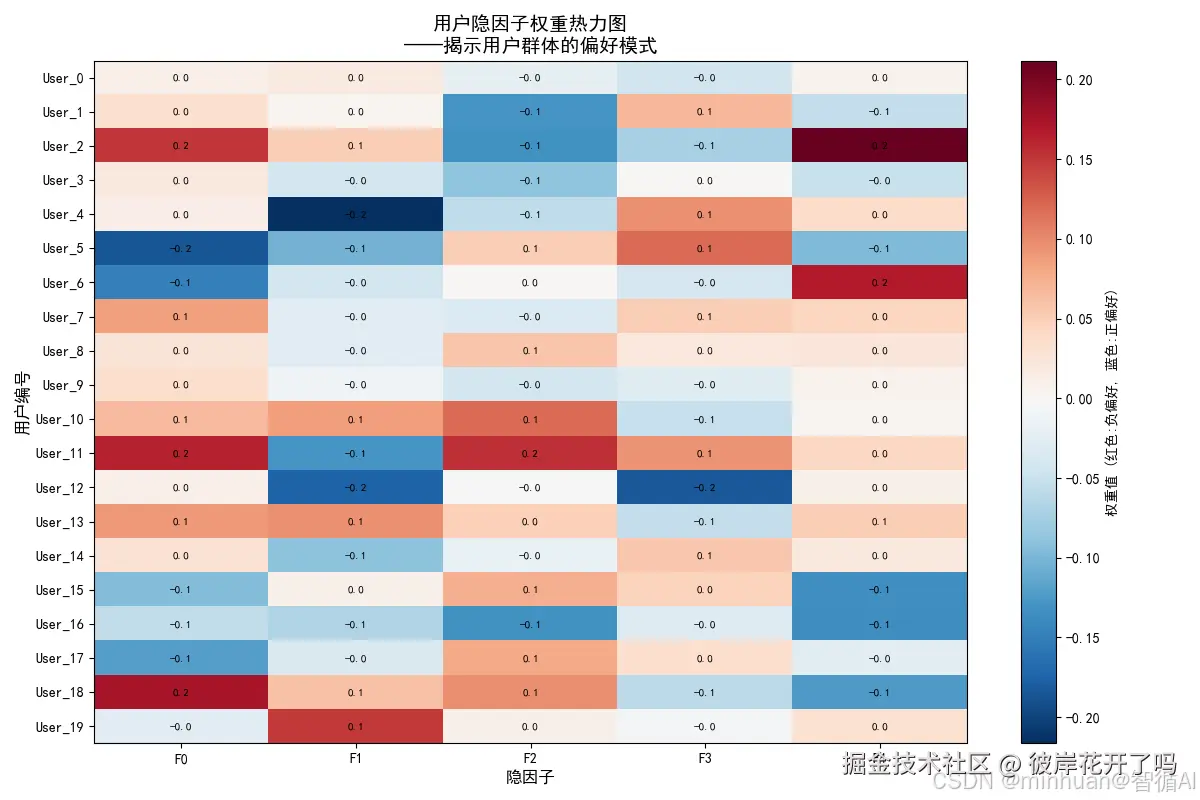- 列模式:每个因子的用户分布(如F1列多为蓝色,说明大多数用户喜欢浪漫)