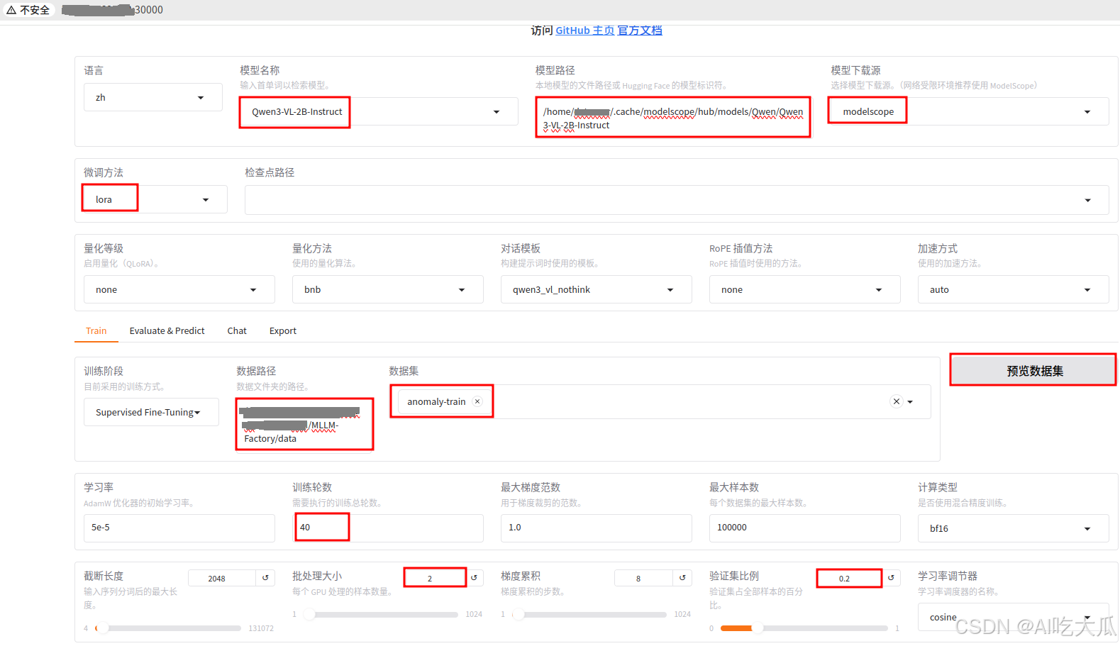 - 数据路径:数据路径必须包含dataset_info.json ,默认是LLaMA-Factory项目的./data路径,由于我们使用外部数据训练,因此数据路径设置为**我个人的项目(MLLM-Factory)根目录./**data绝对路径。MLLM-Factory/data已经存在了dataset_info.json数据集。