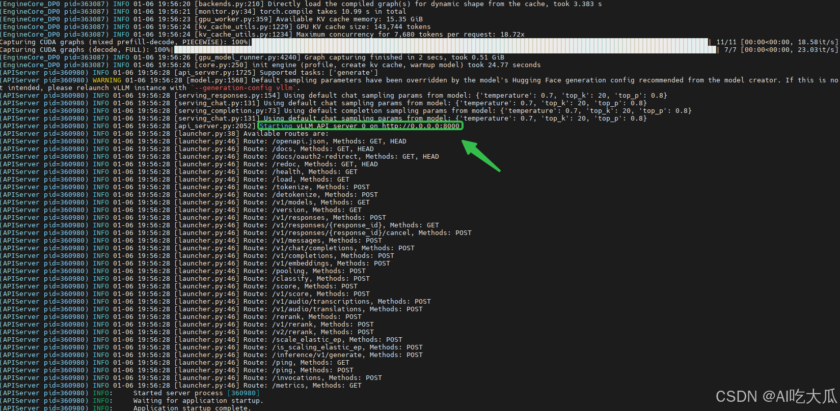 启动成功后,可以看到 Starting vLLM API server 0 on http://0.0.0.0:8000等信息,这是就是vLLM服务接口,后续可以基于该接口实现聊天对话功能。关于接口说明,请参考https://vllm.hyper.ai/docs/