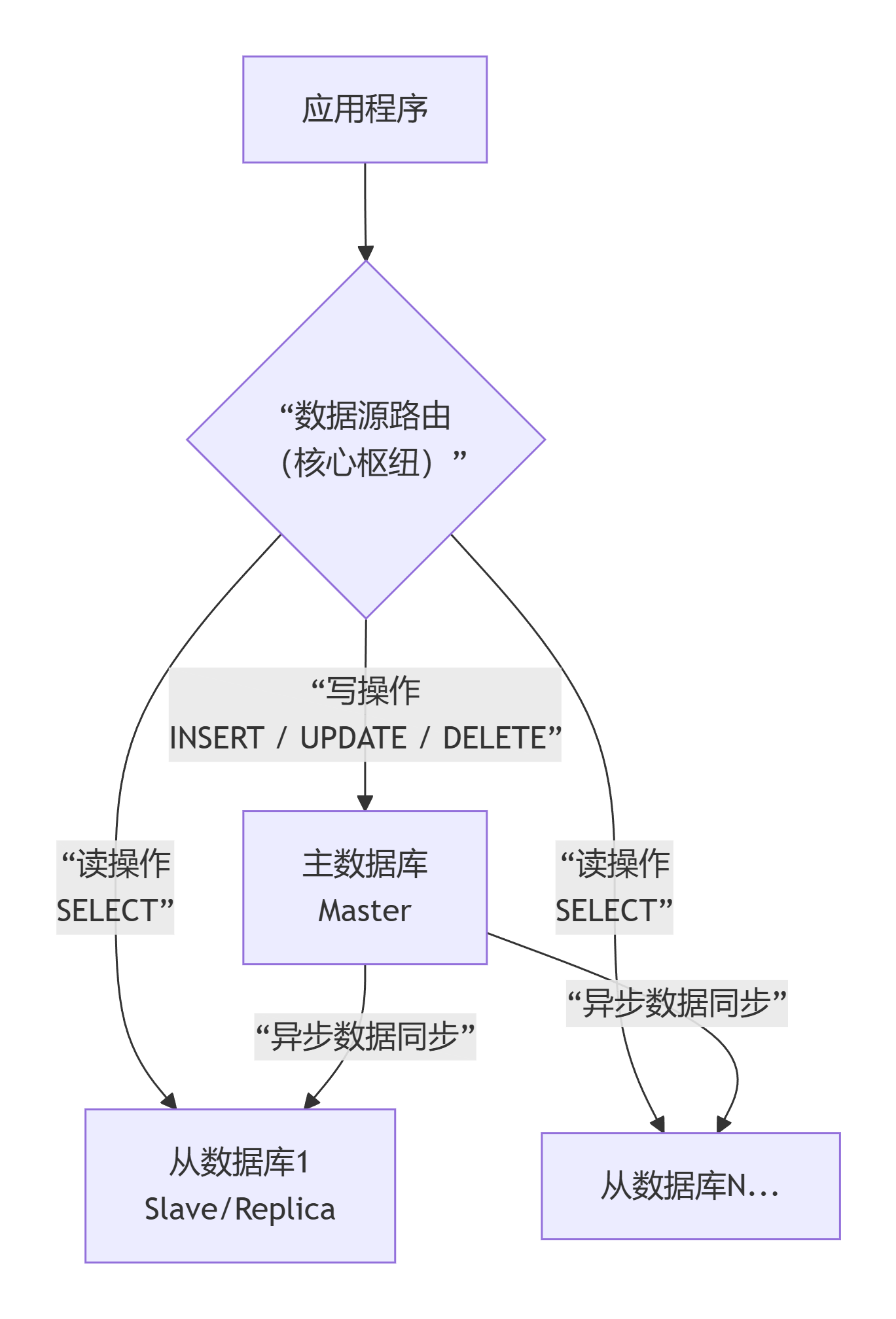 路由枢纽(核心):这是实现分离的关键。应用程序不直接连接某个数据库,而是连接一个"路由层",由它根据SQL操作的类型,自动将请求分发到正确的数据库。