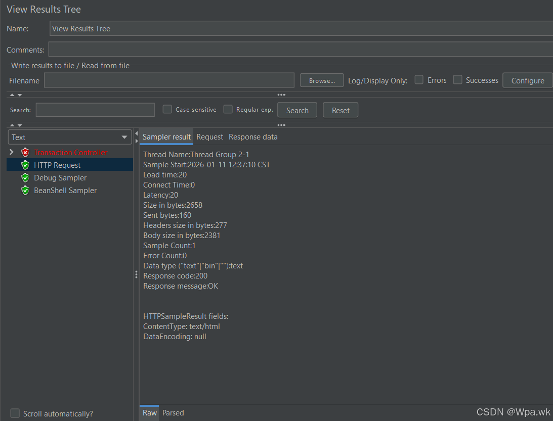 作用:是在测试执行过程中插入一些调试信息,以便检查测试计划的执行过程和结果。Debug Sampler 并不发送实际请求到服务器,而是用于输出调试信息到 JMeter 的结果树中,以便于后续分析和调试