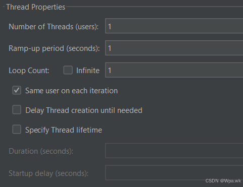 举例:线程数设置为 50,此处设置为 5,那么每秒启动的线程数 -> 线程数 50/5 = 10, 这里只是大概估算,不是精确数值; - Loop Count:循环次数。Infinite 为永远,勾选之后就会一直循环。