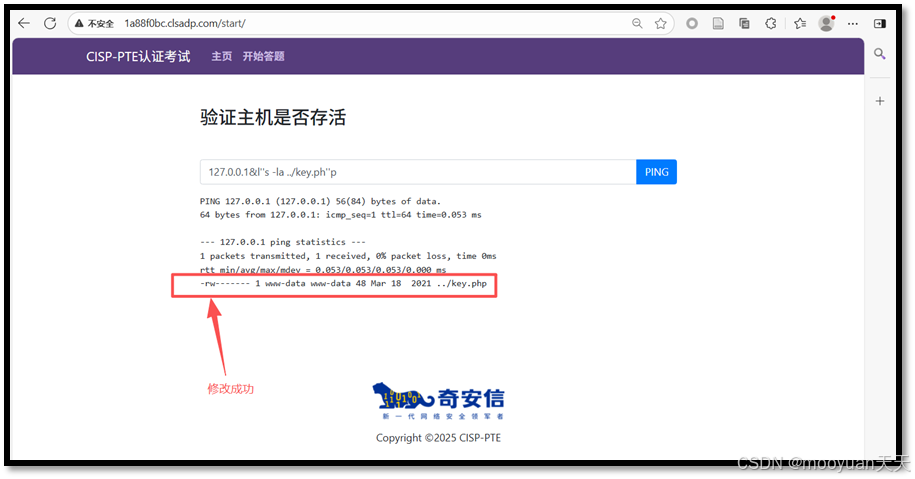 构造攻击payload,通过合法IP地址127.0.0.1绕过验证,使用&命令分隔符在后台执行ping的同时,利用空单引号对chmod命令和文件路径进行混淆,将chmo''d 600 ../key.ph''p在Shell解析时还原为chmod 600 ../key.php,从而修改上级目录中key.php文件的访问权限为仅所有者可读写。具体payload如下所示。