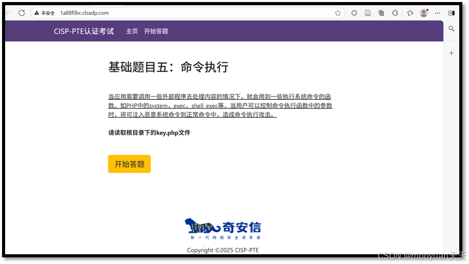 打开靶场,页面提示"命令执行是指攻击者通过浏览器或者其他客户端软件提交一些cmd命令(或者bash命令)至服务器程序,服务器程序通过system、eval、exec等函数直接或者间接地调用cmd.exe执行攻击者提交的命令。通过你所学到的知识,通过执行Linux命令获取webshell,答案就在根目录下key.php文件中。请开始答题!"