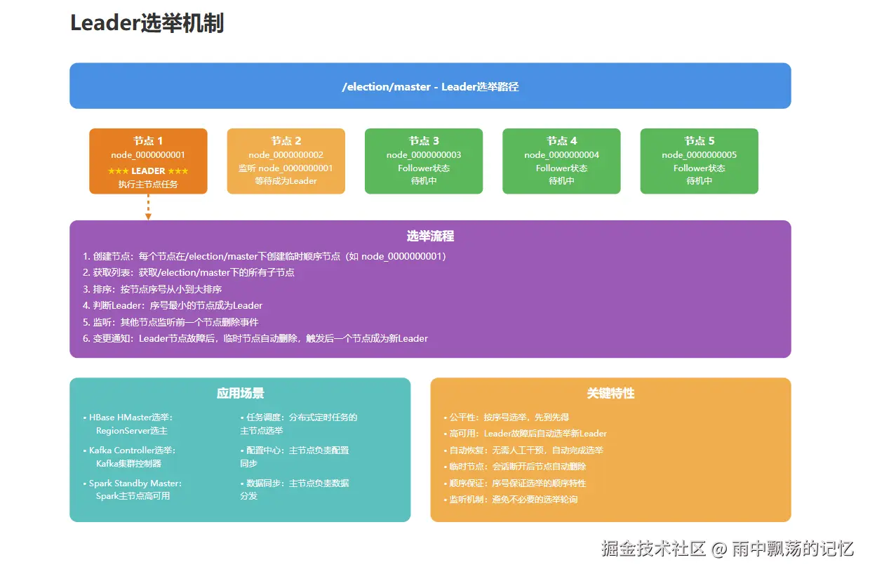 场景描述 : 在集群环境中,需要从多个节点中选出一个Leader节点负责执行特定任务。