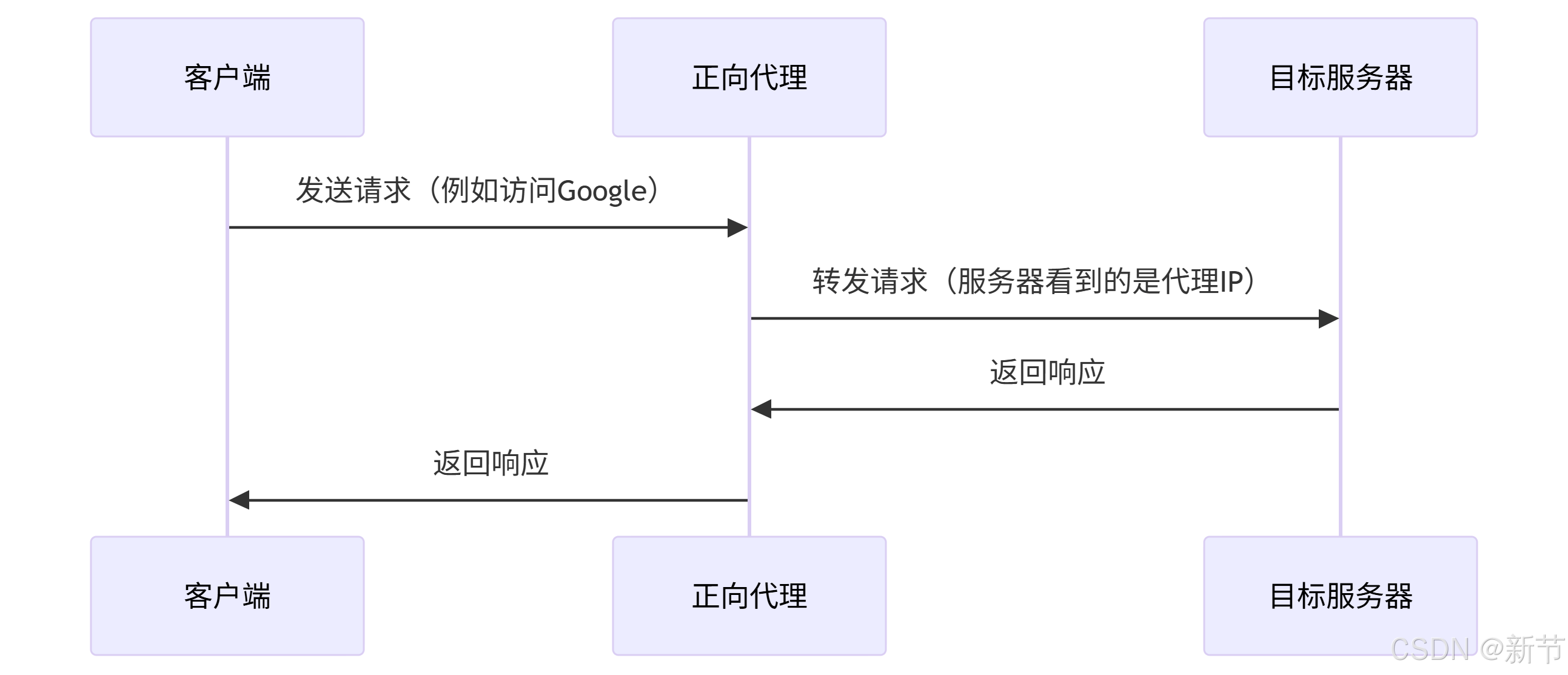 | 正向代理 | 代理客户端请求,隐藏真实客户端信息 | 企业内网访问外网、爬虫代理 |