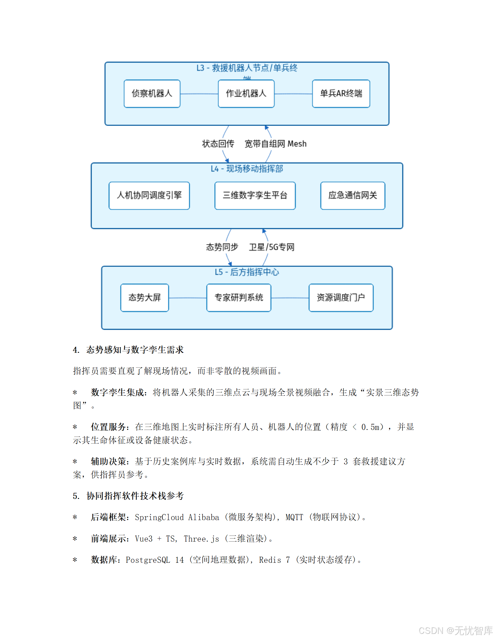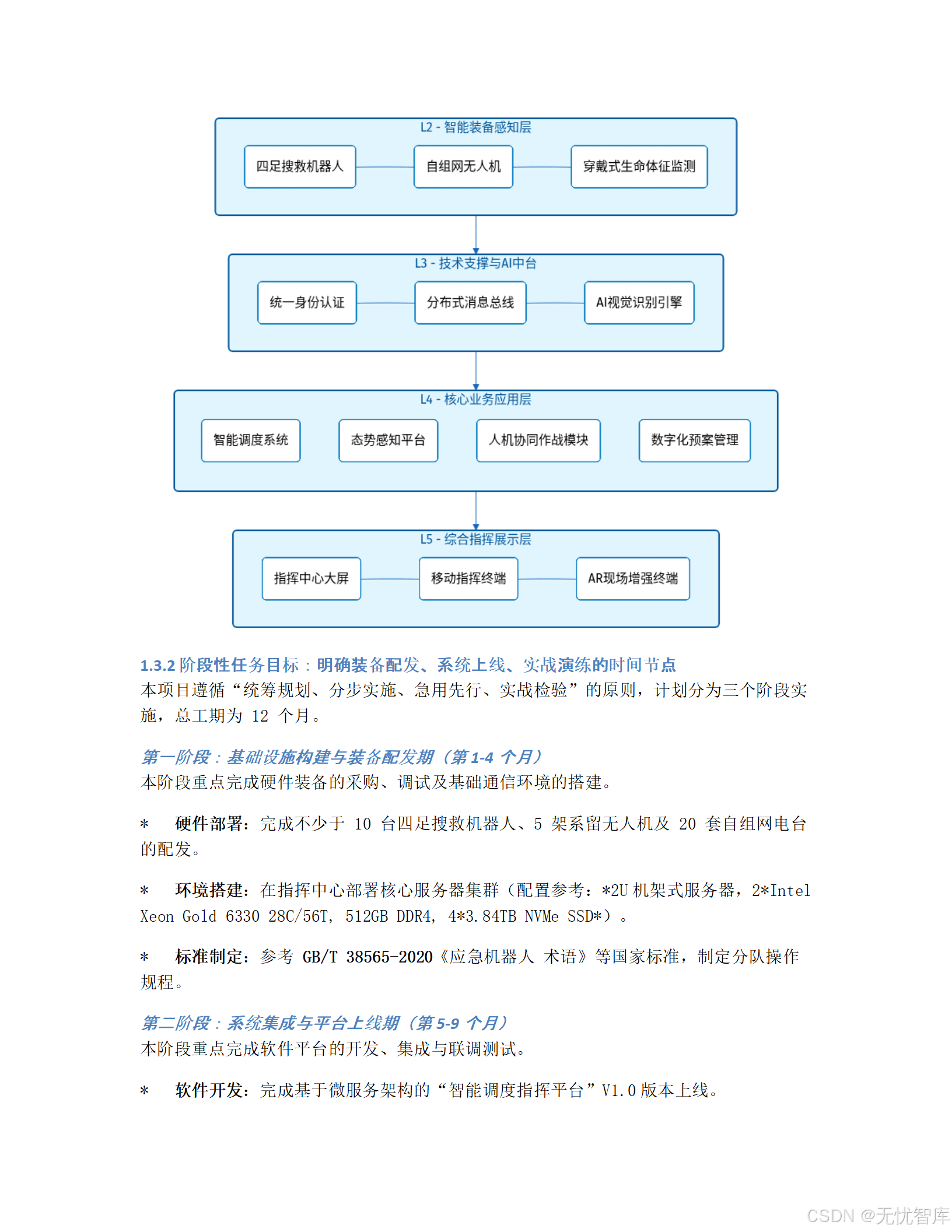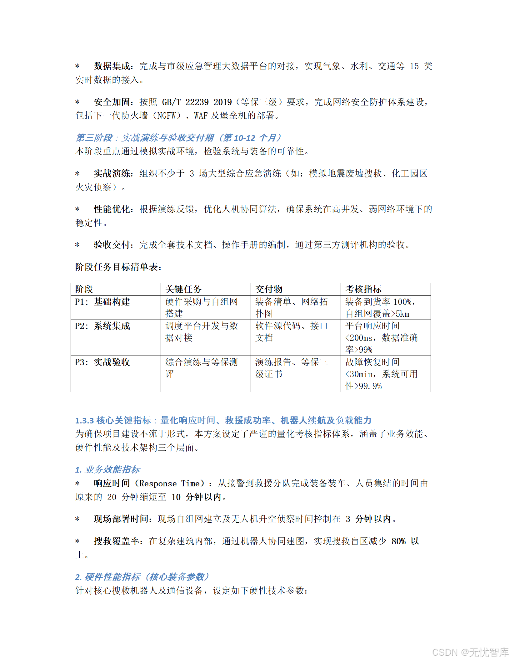 摘要:本文全面拆解《某应急救援中心特种人形机器人救援分队与装备保障建设方案》,从顶层设计、阶段目标、核心指标到技术架构,逐层剖析如何打造一支"召之即来、来之能战、战之必胜"的智能化救援力量。全文超8000字,深度结合国家标准、前沿技术与实战需求,为智慧应急体系建设提供可落地的参考范本。