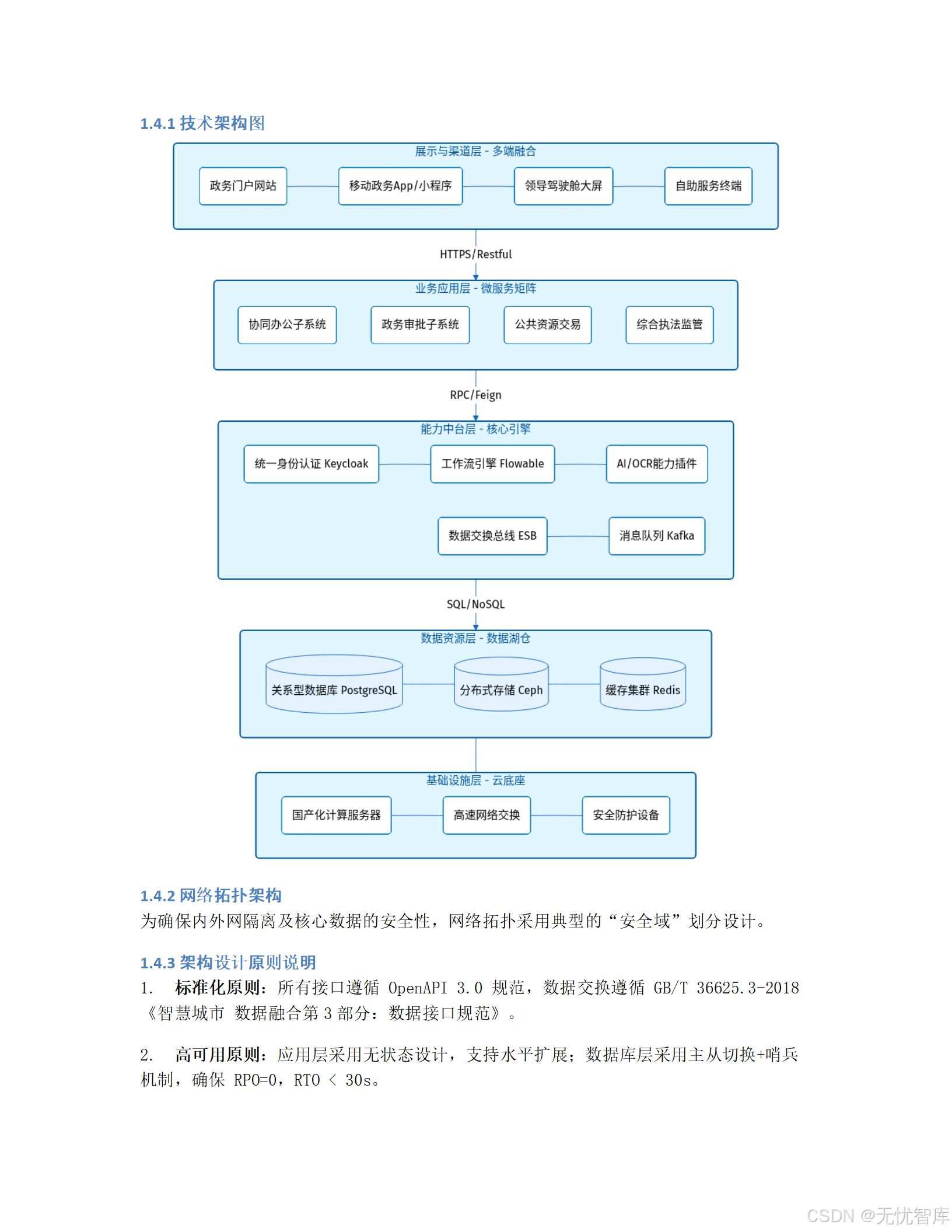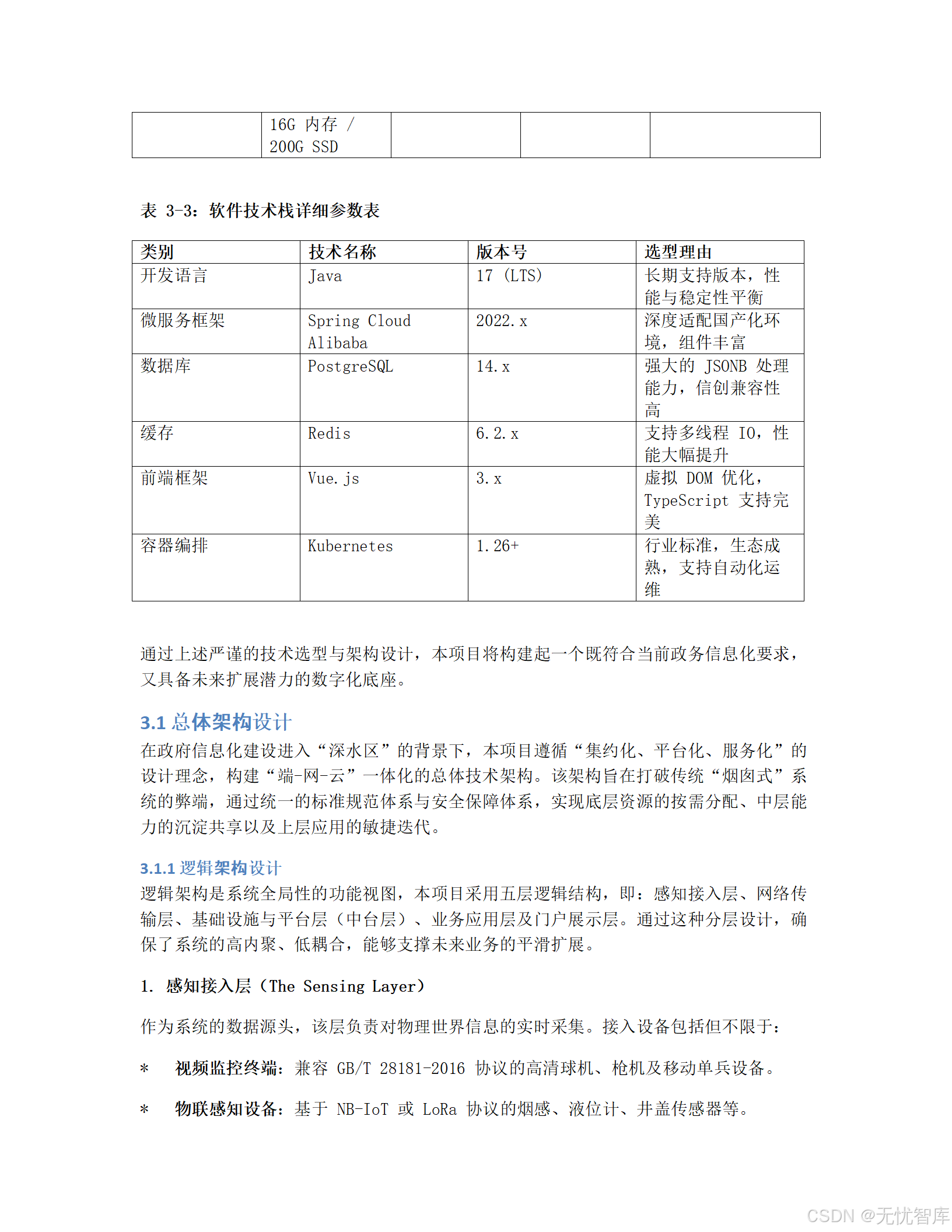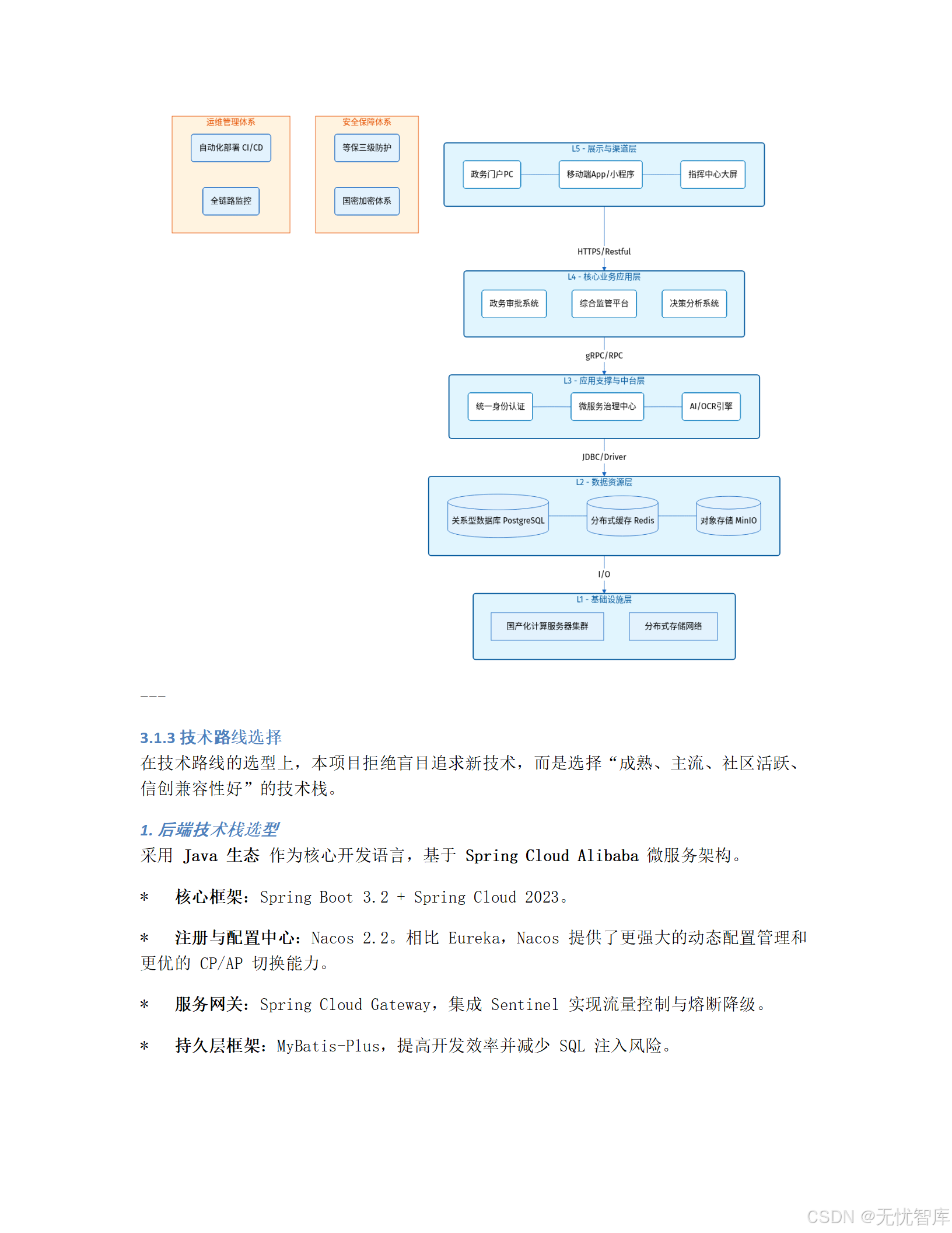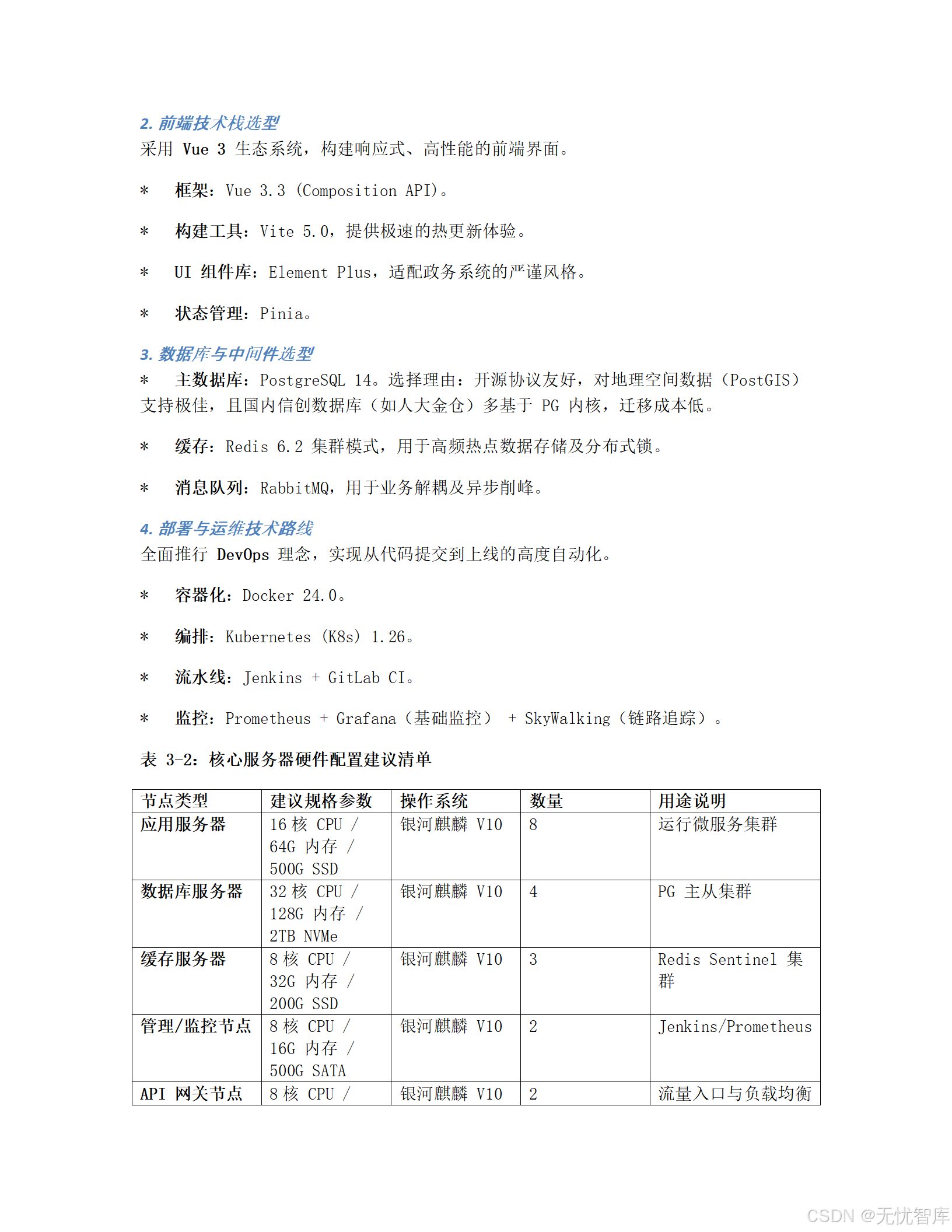 选型逻辑 :这套技术栈兼顾了先进性 (微服务、云原生)与稳定性(PostgreSQL、Redis均为业界久经考验的组件),是政务系统的理想选择。