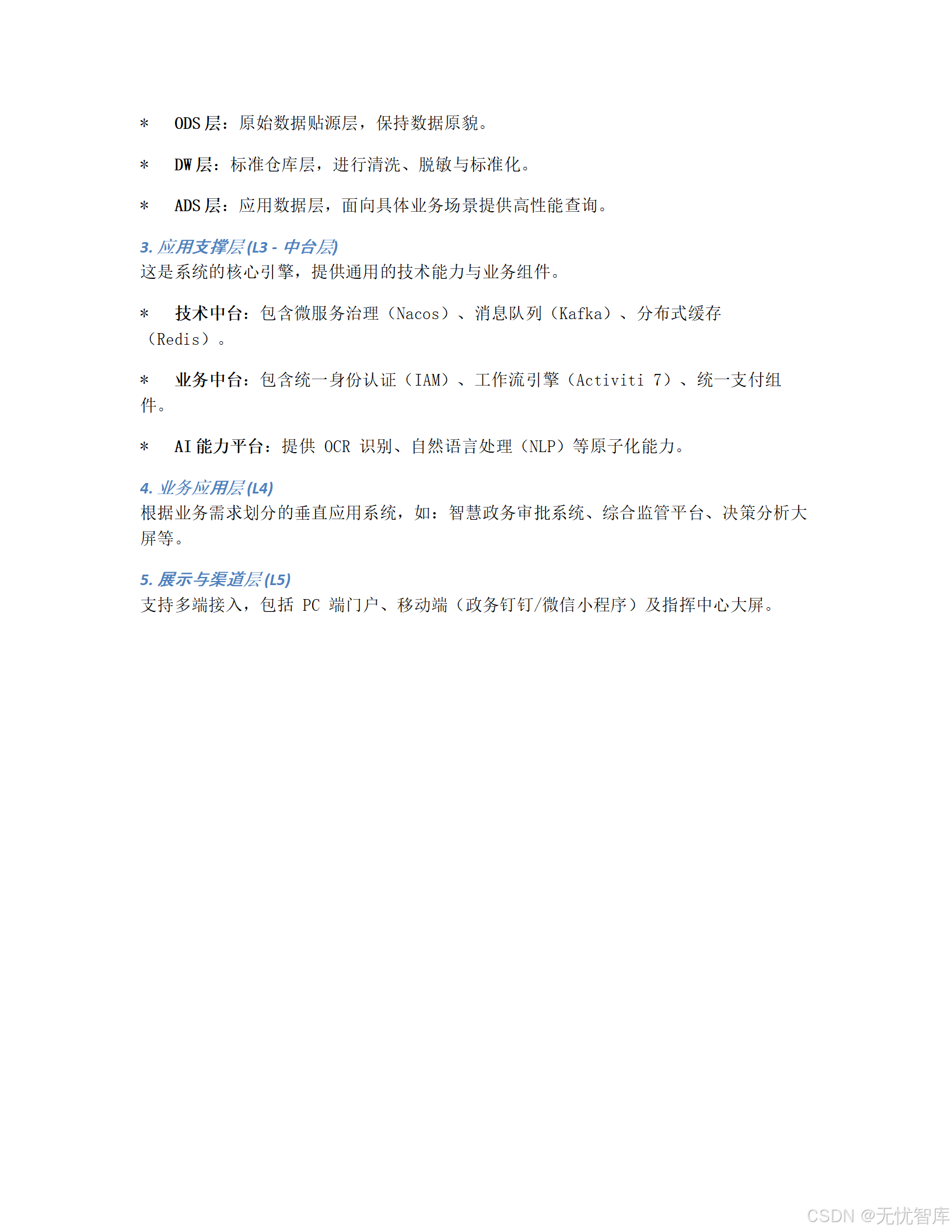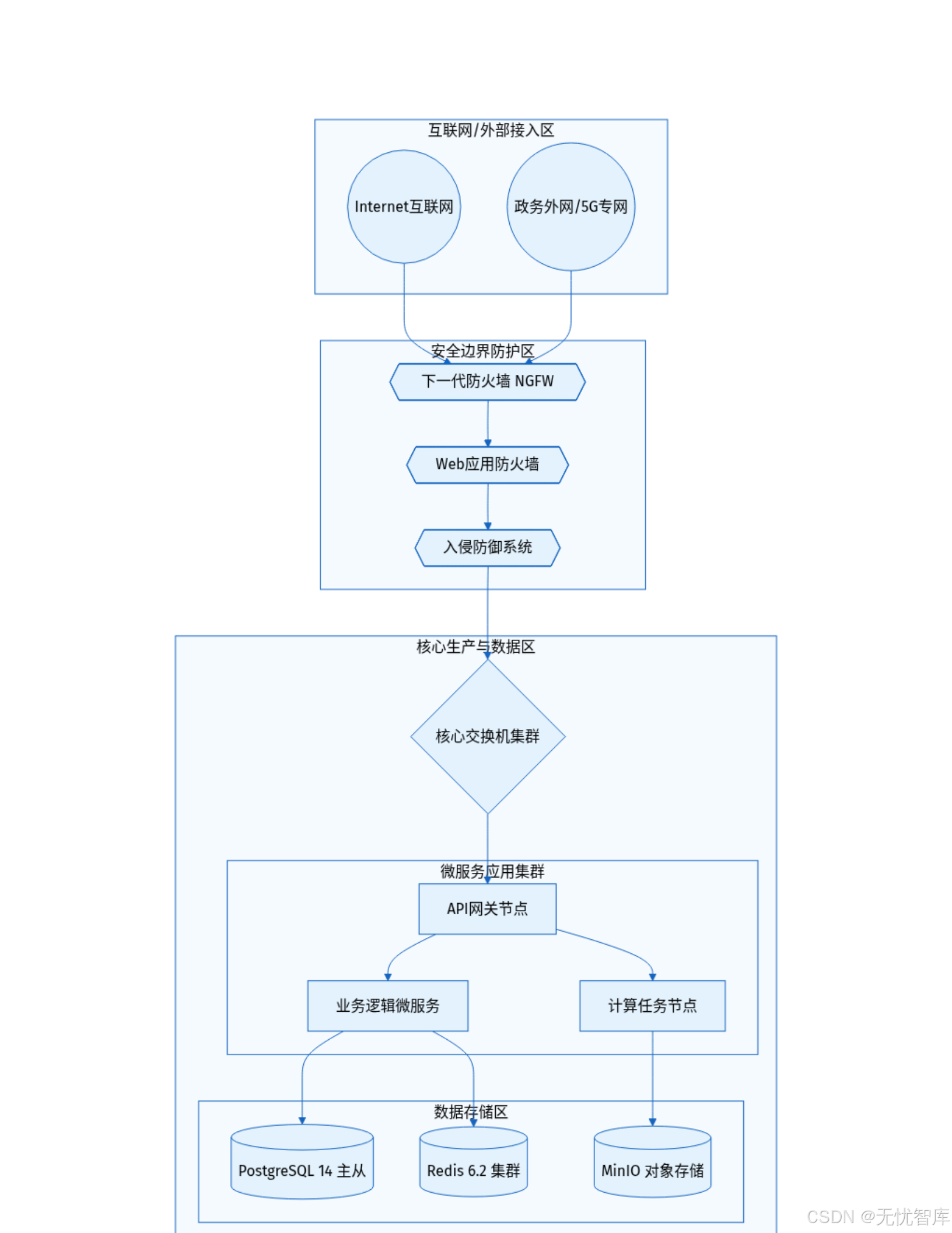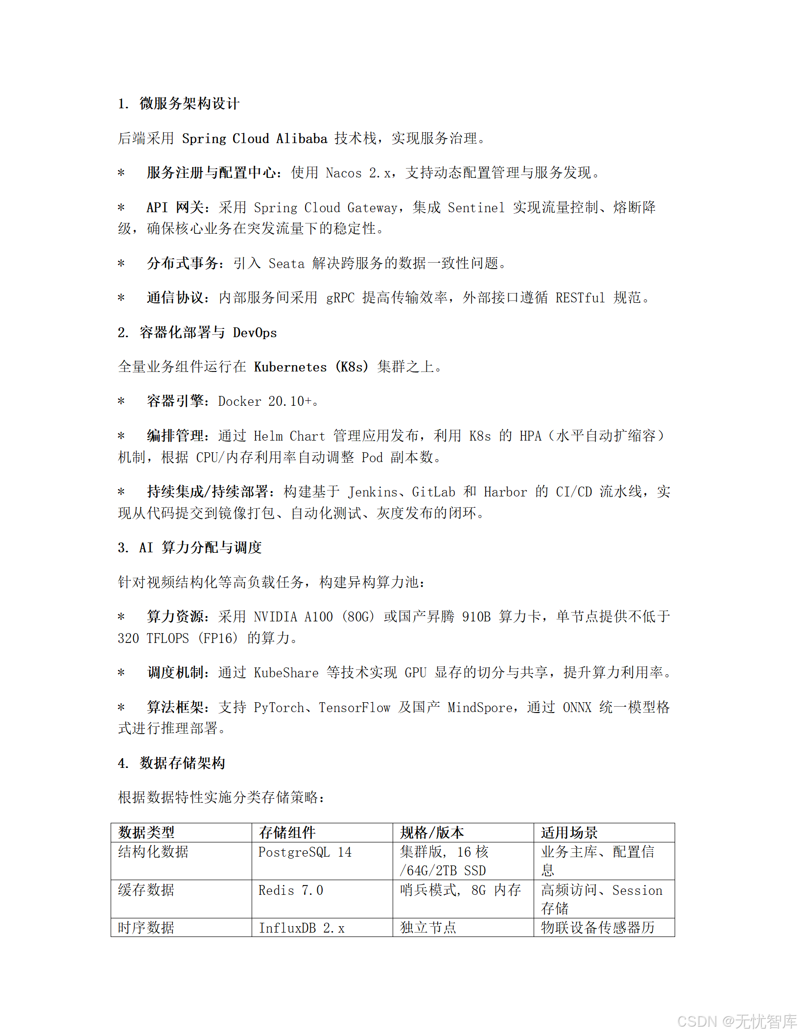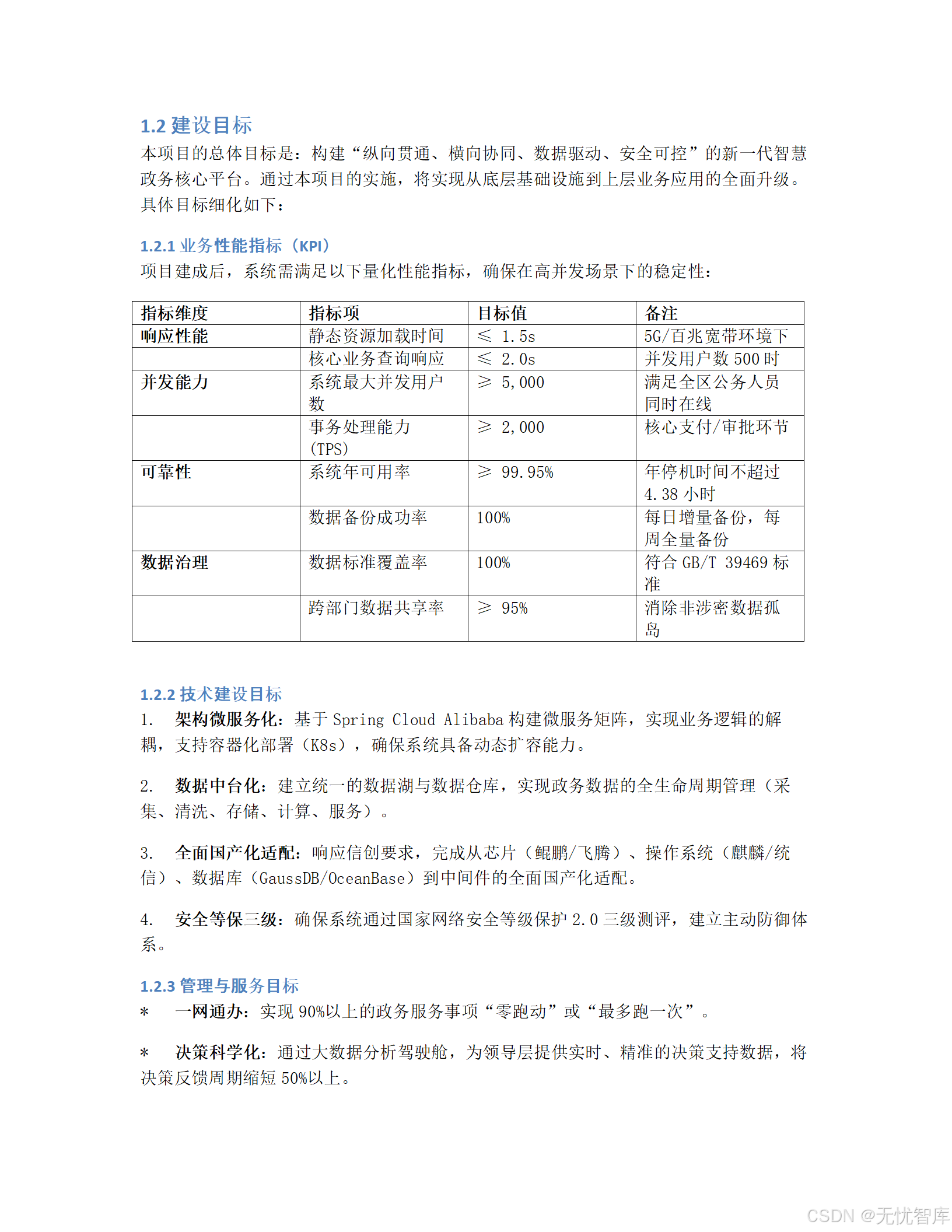 选型逻辑 :这套技术栈兼顾了先进性 (微服务、云原生)与稳定性(PostgreSQL、Redis均为业界久经考验的组件),是政务系统的理想选择。
