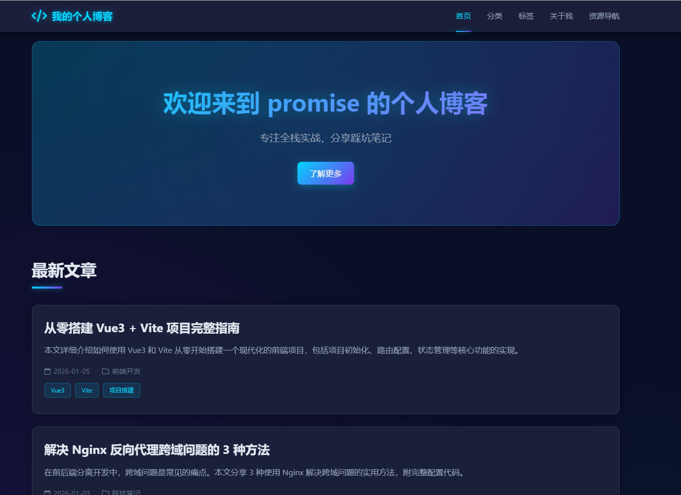 我需要做一个个人博客的前端项目,使用 Vue 3 + Vite 构建。请帮我完成这样一个系统。