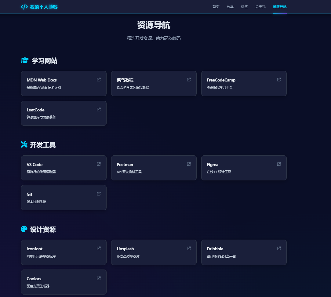 ✅ 完整的页面结构(首页、关于、分类、标签、文章详情、资源导航、404)
