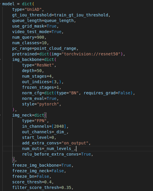 这段代码配置的是一个 UniAD(Unified Tracking and Detection)模型的超参数和架构。
