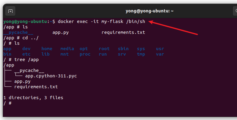docker exec -it my-flask /bin/sh # Alpine 用 /bin/sh