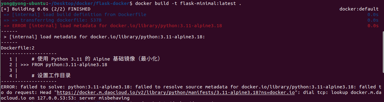 ERROR: failed to solve: python:3.11-alpine3.18: failed to resolve source metadata for docker.io/library/python:3.11-alpine3.18: failed to do request: Head "https://docker.m.daocloud.io/v2/library/python/manifests/3.11-alpine3.18?ns=docker.io": dial tcp: lookup docker.m.daocloud.io on 127.0.0.53:53: server misbehaving