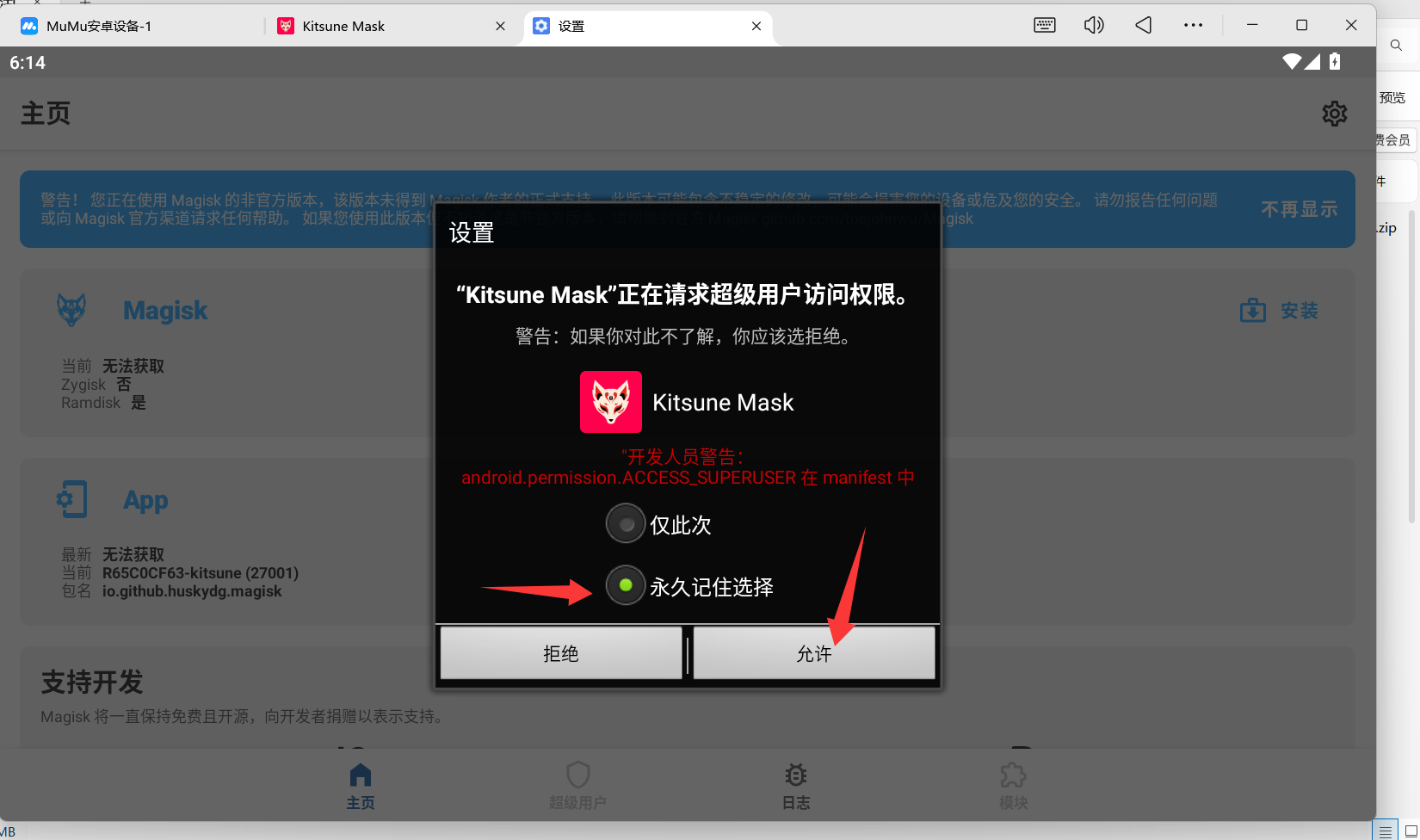 2.打开面具,弹窗授权超级权限,点允许并永久记住选项